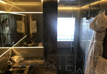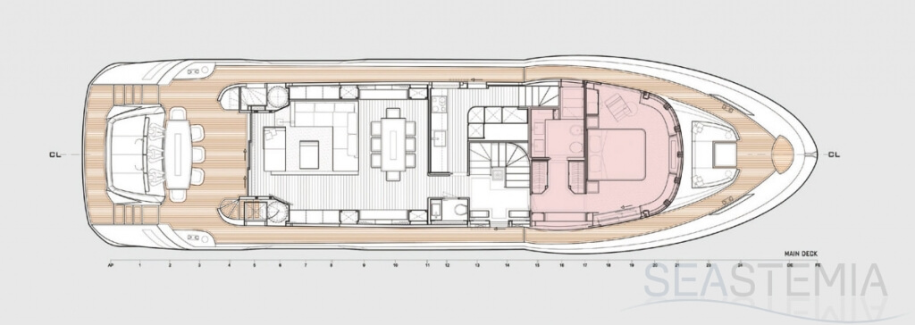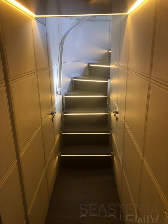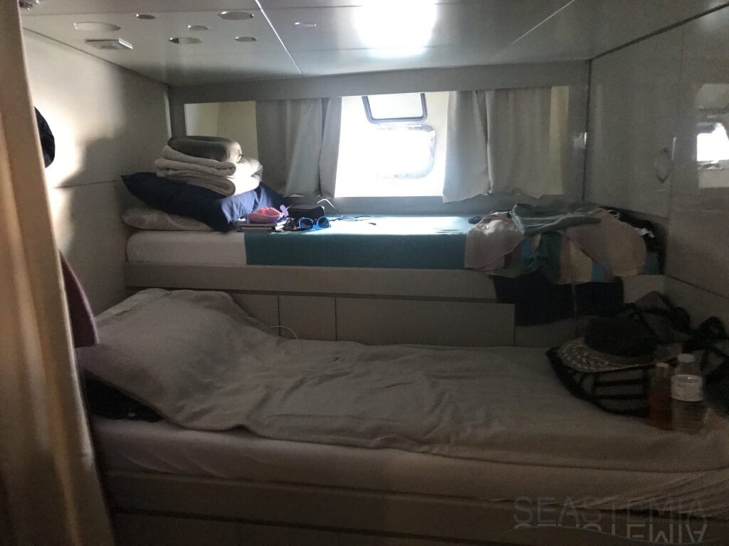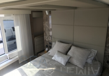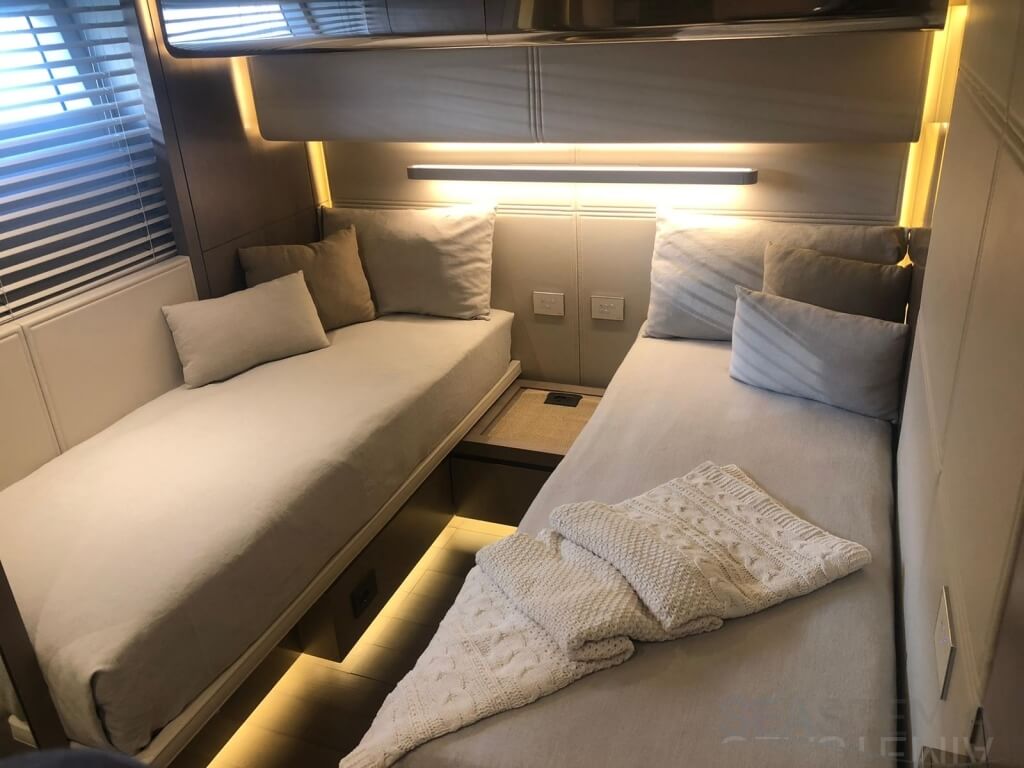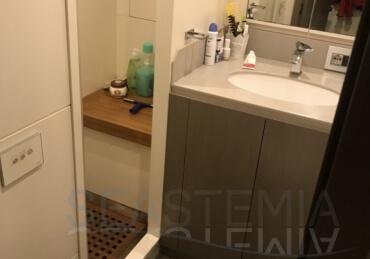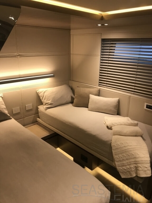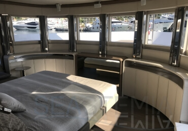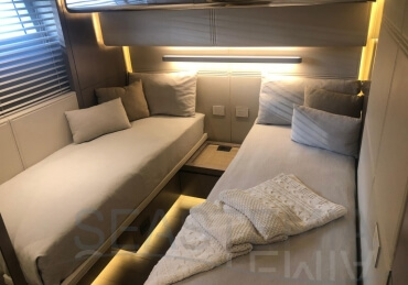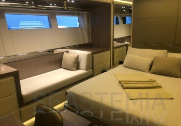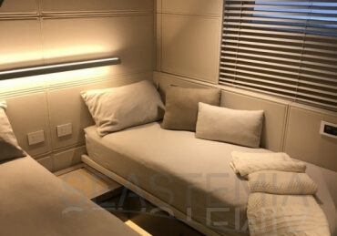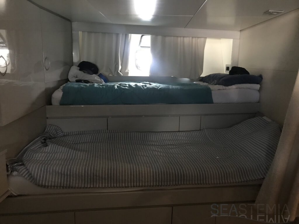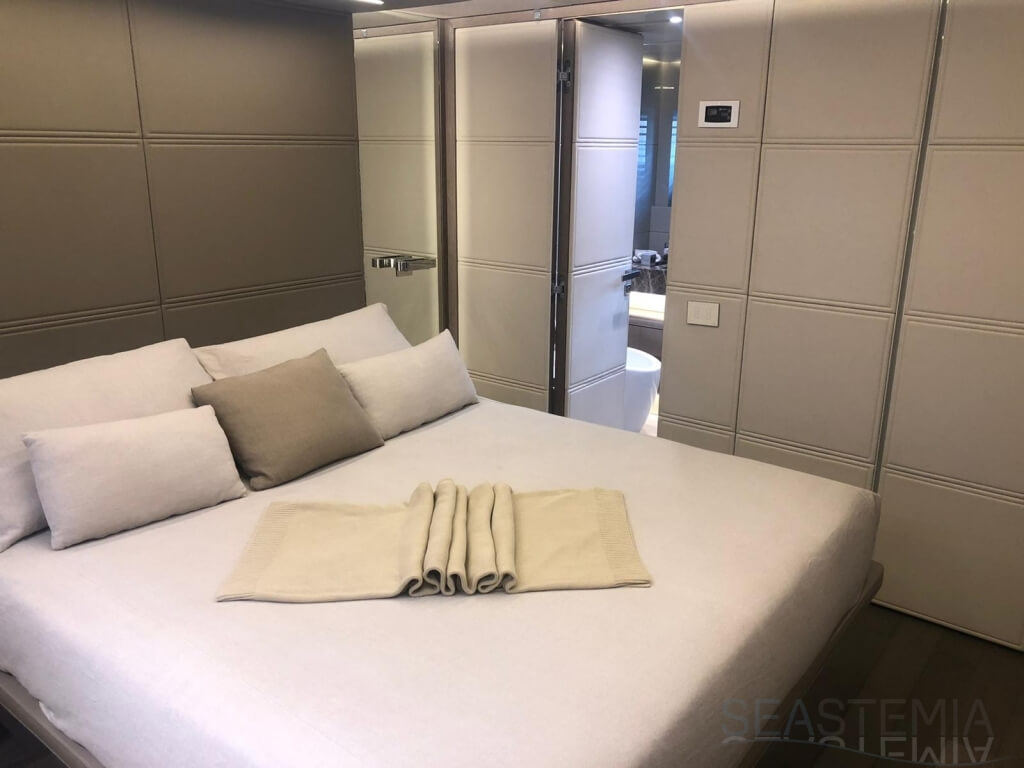 Second owner since new, this 4 cabins layout unit with a panoramic Master ensuite on the main deck, and a second full gauge "Master/VIP" cabin in the lower deck and two additional twins. All cabins are euipped with wardrobe and bathrooms to accomodates comfortably 8 guests on a long cruise, in the nicest light luxrury atmosphere of T4 Design.