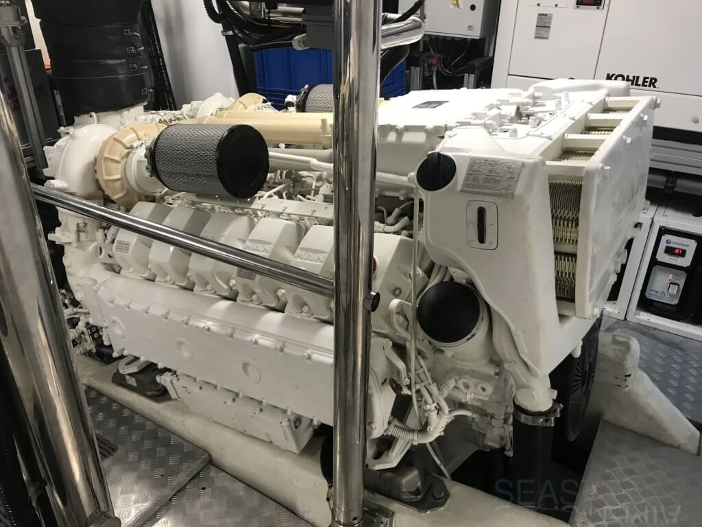 Raised Pilot House type, full on her spec with two V12 MAN 1400Hp engines of 880 hours each, two 27KW generators,  0 speed and navigation fin Stabilizers, garage for a 3.85mtr Williams Jet tender, a very large flybridge with jacuzzi and Paola Lenti loose furnitures, and hydraulic aft swimming platform with Jetski and hydraulic swimming ladder at the aft, a crew quarter for 5 crews, water maker, etc, etc...