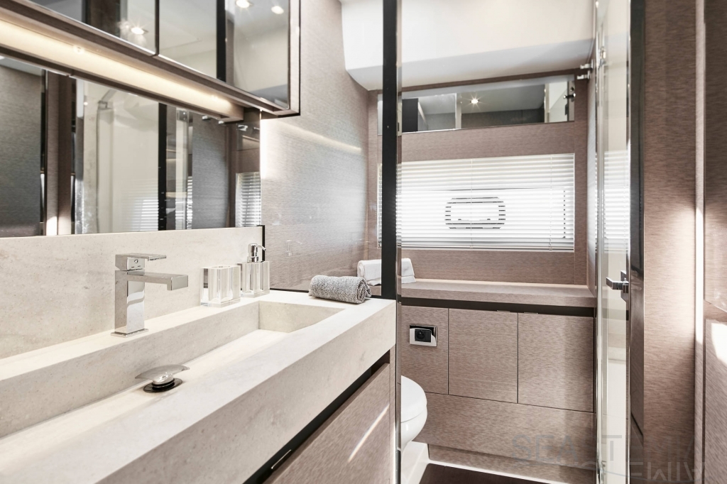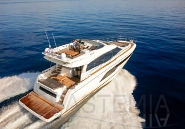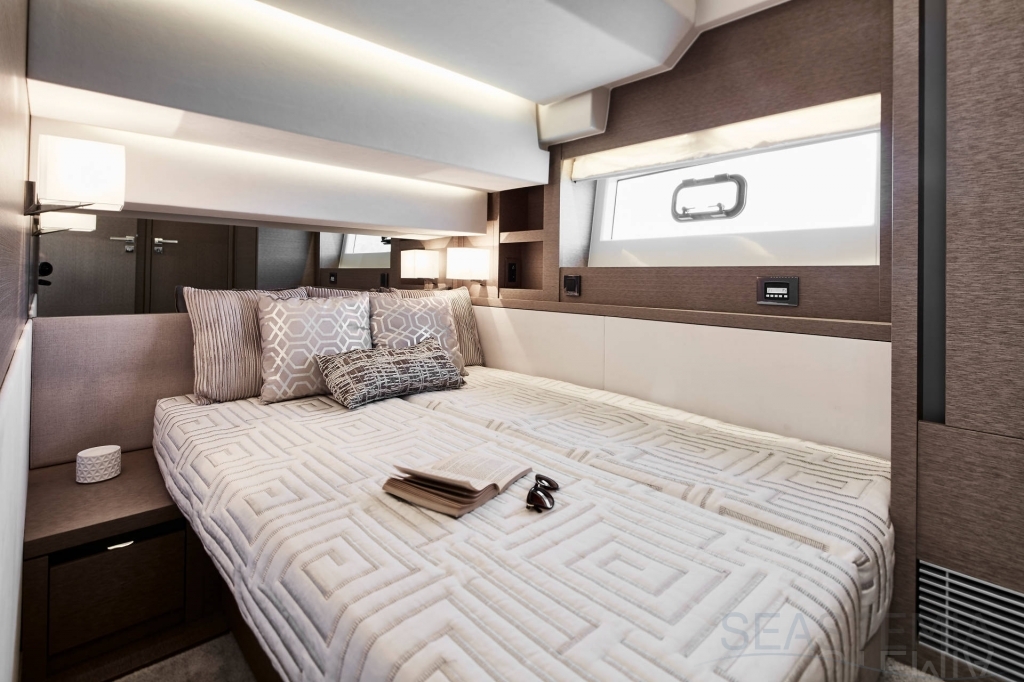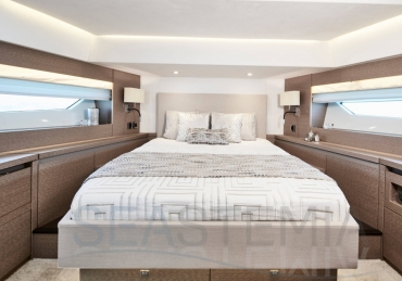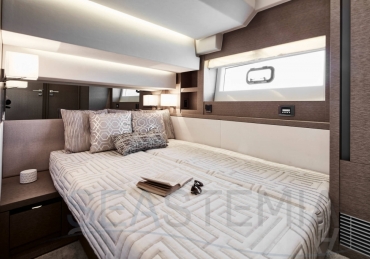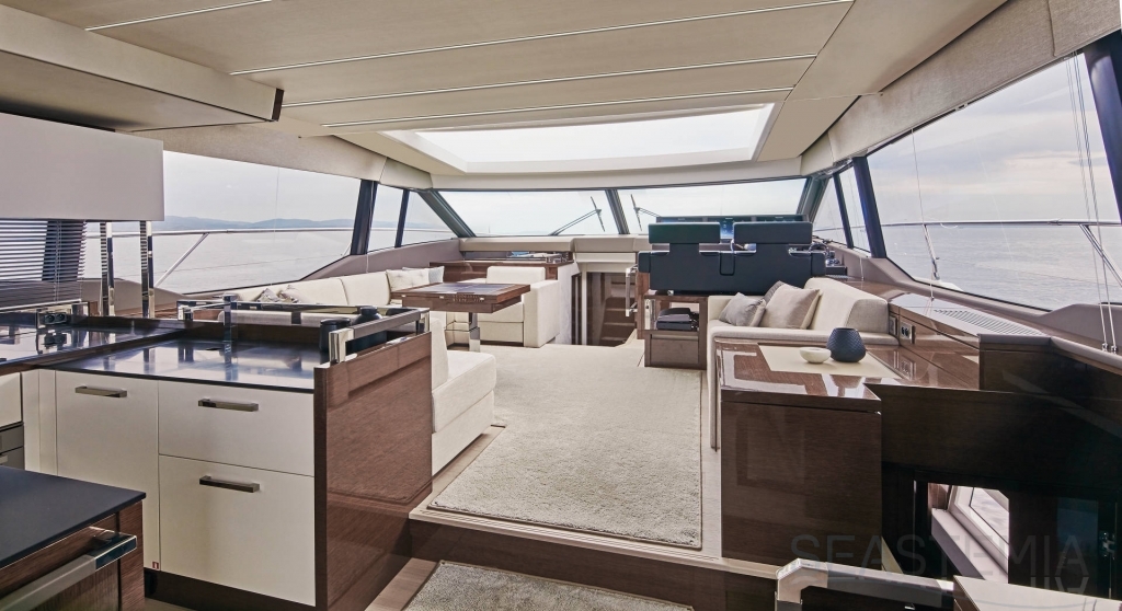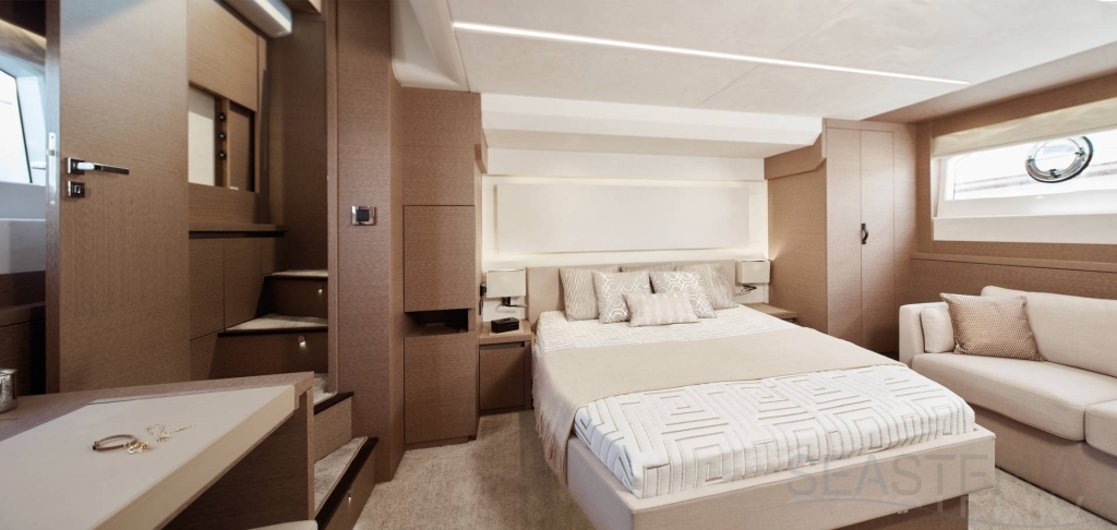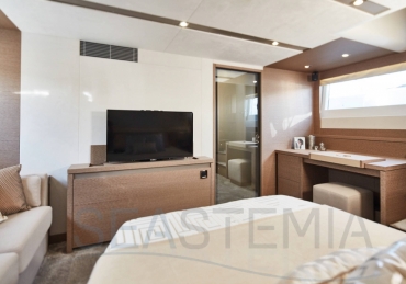 The onboard space is optimized with various amenities such as an ice maker in the cockpit, a 5 kg washer-dryer, a dishwasher, air conditioning for the crew cabin, a Greco Black laminate countertop in the galley, and a crew cabin equipped with a WC and shower. The salon features a luxury electric table, with teak flooring on the sportfly and brushed Wengé floors in the entrance and salon.