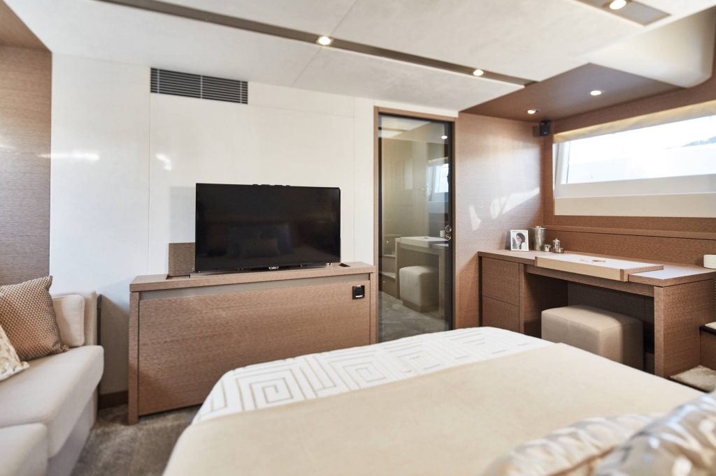 Among the numerous features are a complete electronics package, a Bowers & Wilkins audio system, an electric capstan for portside aft mooring, a sportfly protective cover, an electro-hydraulic sportfly bimini, an integrated hydraulic telescopic gangway, a hydraulic swim platform, and underwater lights.