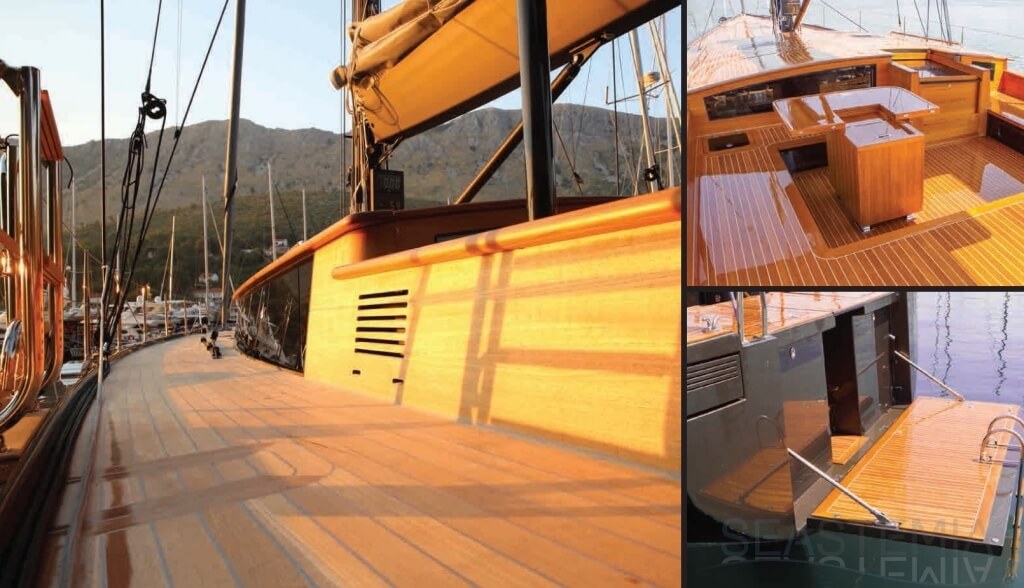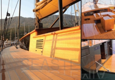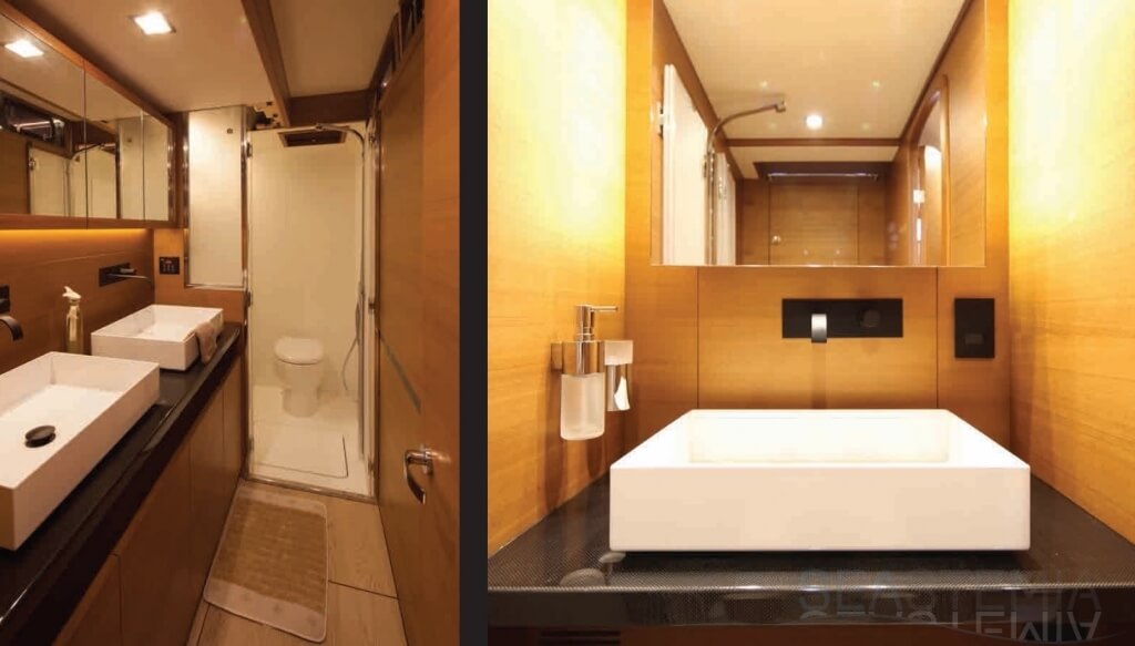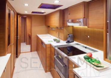 Deckhouse with living room and navigation corner. 3 bedrooms: 1 Master bedroom with king size bed, 2 generous guest cabins with numerous storage spaces and all the bedrooms with ensuite shower rooms. Fully equipped galley
