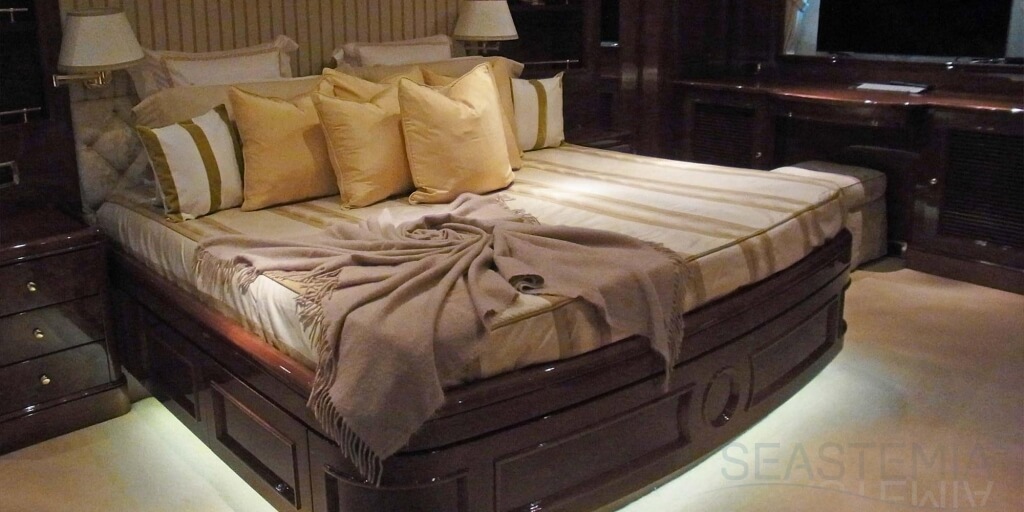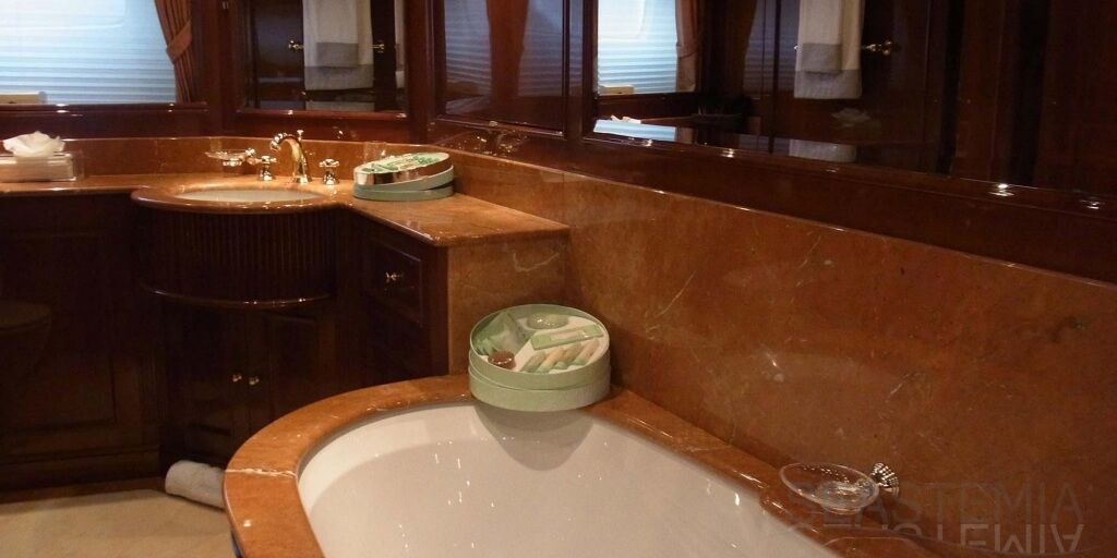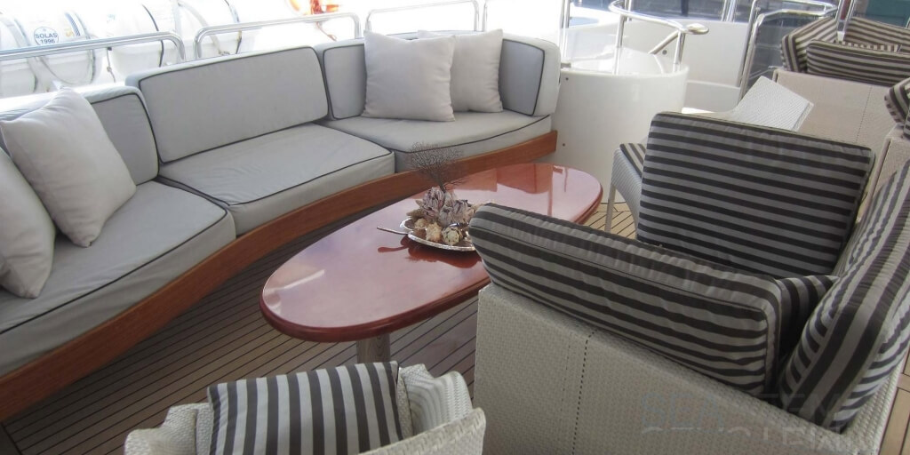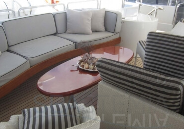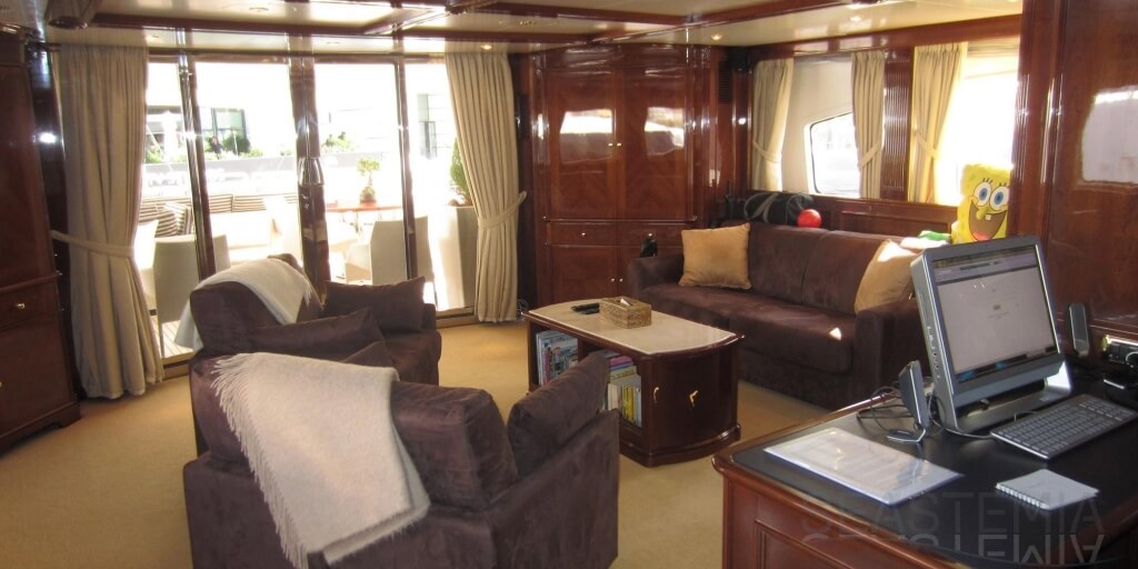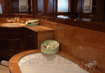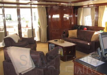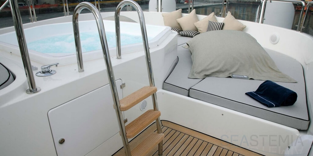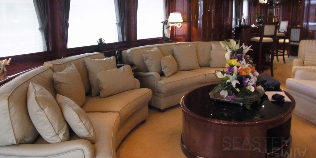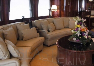 SATINE captures timeless Benetti styling, while packing the amenities of a 40m yacht into that of a 35m. A rare find for yachts in this size range is the relaxing sky lounge, featuring a second bar and day head. The main deck features a full beam Master stateroom, a large saloon and dining room, separated by a bar for entertaining. A full beam VIP stateroom and 2 twin staterooms are located on the lower deck.