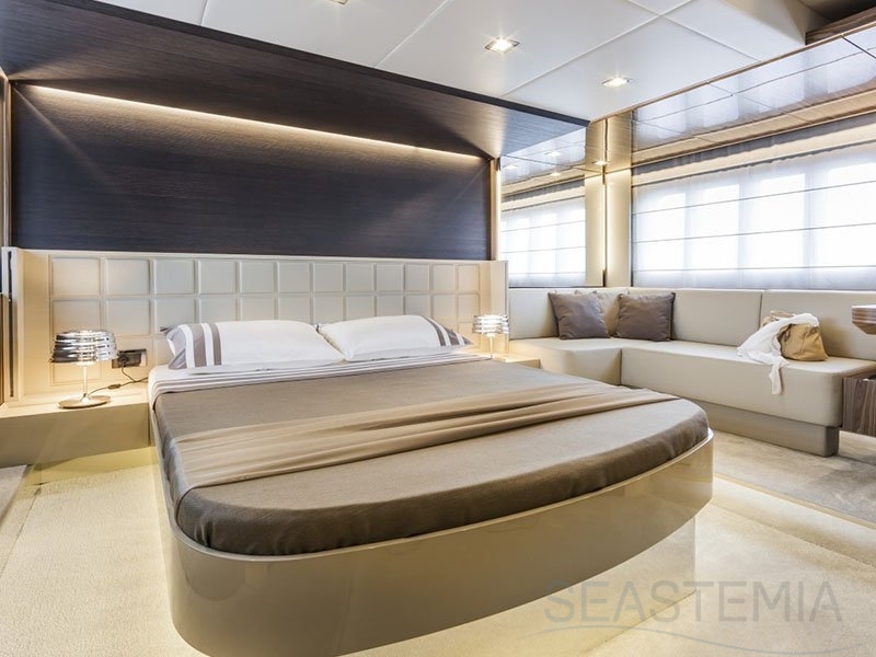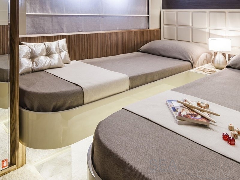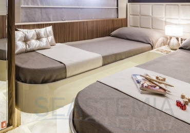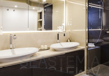 The spacious salon with comfortable white sofas and large-screen television creates a perfect area to relax. Panoramic windows allow plenty of natural light through. The yacht sleeps up to six guests in three modern design staterooms. The master cabin and the VIP cabin are accommodated with a king-size bed and the third cabin with twin beds.