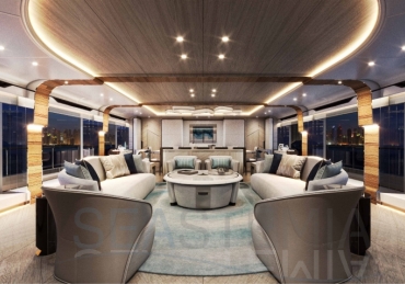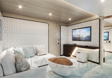 Her opulent exteriors feature an incredibly expansive sun deck, infinity pool, a hybrid beach club, fold-down balconies, and a swim platform providing guests unprecedented ease of access to the water. Her smart layout can accommodate up to 12 guests across its seven lavish staterooms, and can also host a crew of up to nine members with five large crew cabins and private captain’s accommodation.
