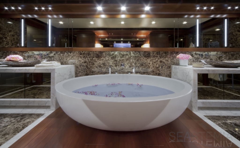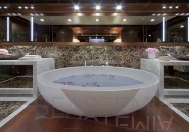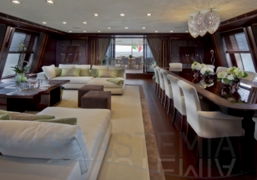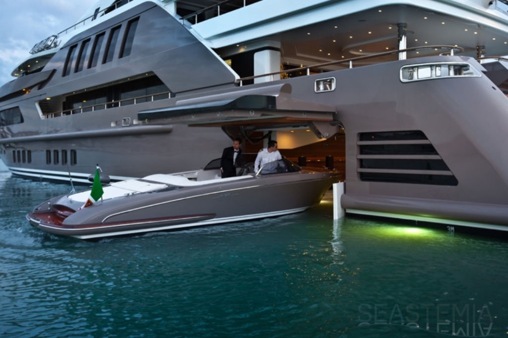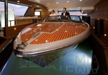 An innovative solution with a floodable floating dock on the port side that becomes a swimming pool that together with the indoor-outdoor area of the beach club create an extraordinary open air living area at sea level.