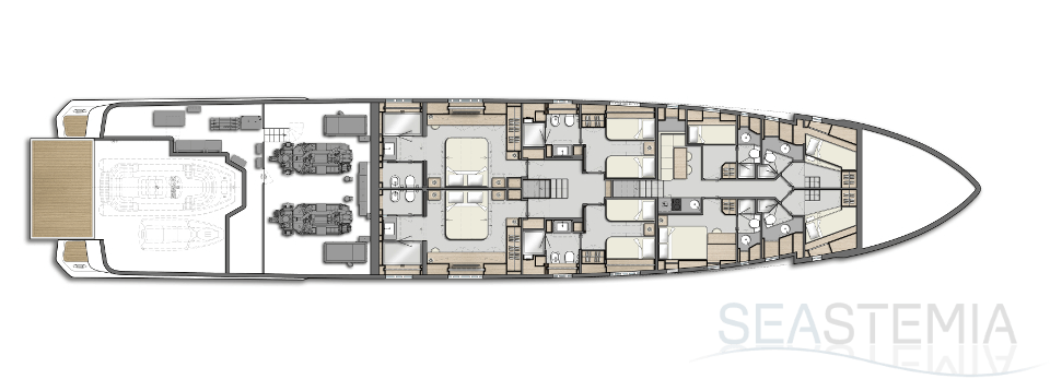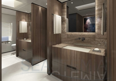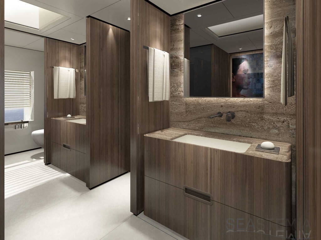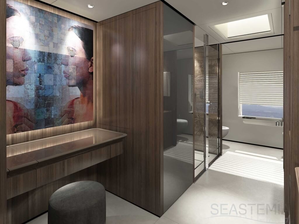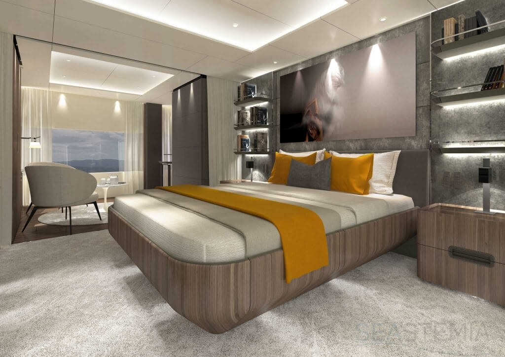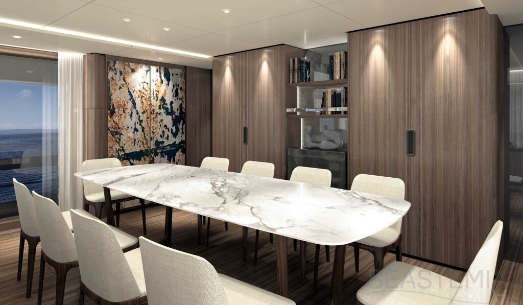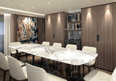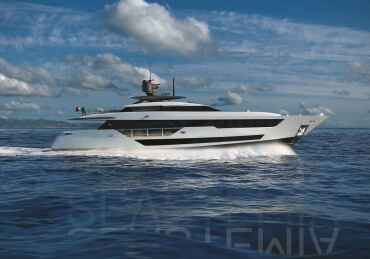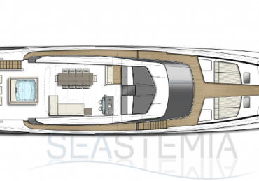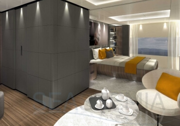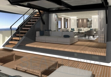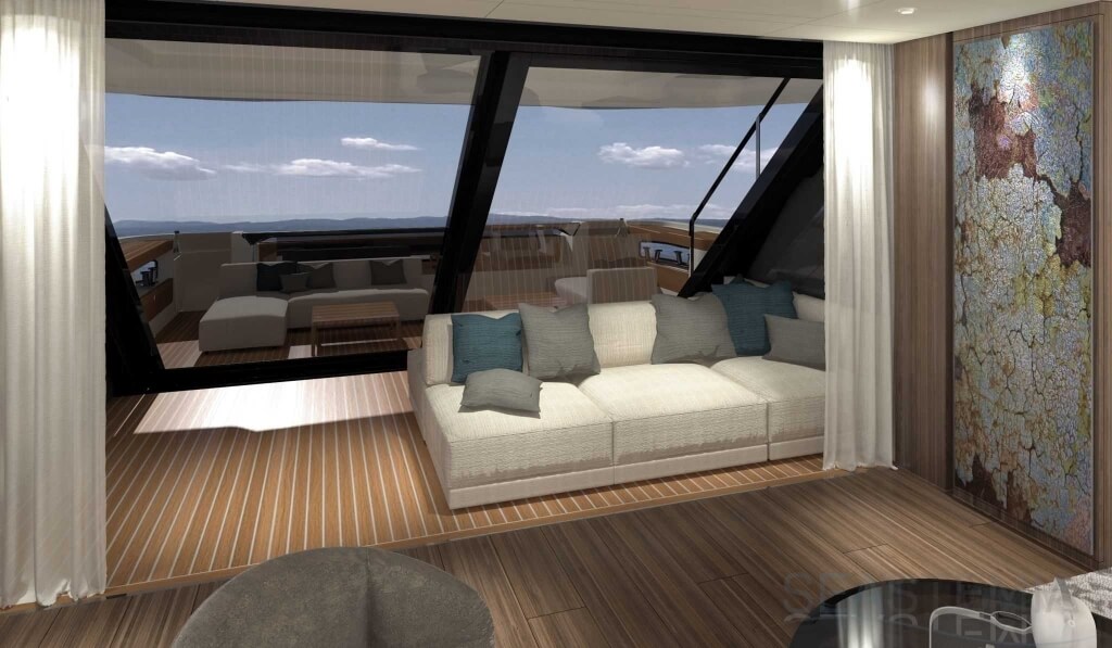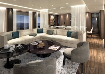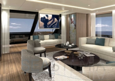 Custom Line 120’, the new jewel of the series and the first Custom Line planing yacht designed by Francesco Paszkowski Design, is a collaboration between the Milanese architect’s studio, the Ferretti Group Strategic Product Committee and Engineering Department. The Custom Line 120’ reimagines and combines many stylistic elements, even from automotive design and residential architecture, adding thorough research to bring out shapes and volumes, through layout choices in line with the most recent trends in contemporary living. As is tradition, everything is personalized to the owner’s wishes, because a Custom Line yacht represents those who live onboard. Totally new is the design of the hull shapes and lines, which will be realized by infusing and assembling the built structures together, to ensure maximum strength and lightness, thanks to the use of carbon. The project proposes an aesthetic standard with maximum formal simplicity that creates a unique example of the exterior design and interior settings. The profile is sleek and powerful: strong lines running from bow to stern, giving life to an exciting scene of alternating materials and colors of structural materials and the dark tinted windows; to the cockpit cover and the hardtop, both in metallic gray, give a more aggressive and dynamic look even while in port or at anchor. The windows in the hull are large and generous, while on deck the windows are floor to ceiling and create direct contact with the sea thanks to the pulpits which replace traditional gunwales. The cockpit design is striking with its contemporary style, thanks to the innovative large window that is divided in two sections and can be opened separately. Another prominent innovation is the elevation of the superstructure. This height difference, compared to the bridge, allows for an unparalleled view from the raised salon. The side windows, which are slightly curved, enhance the feeling of living close to the sea.