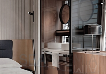 Shaped by architect Filippo Salvetti, who worked with Ferretti Group to devise the external design, this newest member of the fleet opens up a whole new way to experience the sea. The 720’s remarkably ingenious solutions elevate the concept of cruising in luxurious comfort to new heights. It’s about living the sea life in style, in your home on the waves, with all the comforts of a yacht of timeless elegance and a sensation of wellbeing like never before. The Ferretti Yachts 720 debuted at the 2019 Cannes Yachting Festival and caused an immediate stir. With her amazing spaces, unexpected headroom and abundance of areas to enjoy, she takes the cruising experience to a new level. She is the fruit of a partnership between our Product Strategy Committee and the Engineering department – the second yacht with external design by Salvetti and Ferretti Group, with interiors by our own architects and designers. The spacious master cabin echoes the play of colours and materials that grace the main deck, in a peerless private setting that’s a joy to discover. The minimalist yet detailed design provides a continual counterpoint to the walk-in wardrobe and the grand bathroom, where the smoked-glass inserts and functionality of form are in tune with current trends. The winning style of this desirable new model is based on a blend of contrasting textures. The striped ceiling, the ribbed surface of the walls, the grid-pattern headboards and the lounge furniture’s oblique-stripe motif play off one another in a profound natural harmony. The lighting design is an attribute that is unique to the 720. Horizontal LEDs integrate into the ceilings to create a soft, diffuse effect, while independent vertical spotlights with adjustable beams pick out original features with scenic flair. It all adds up to a sublime experience of genuine cruising comfort.