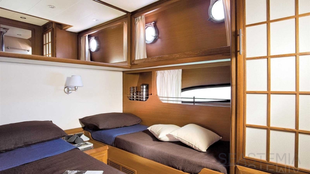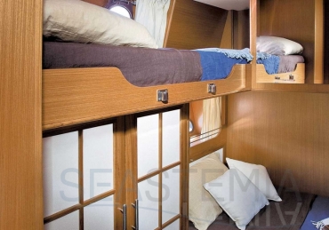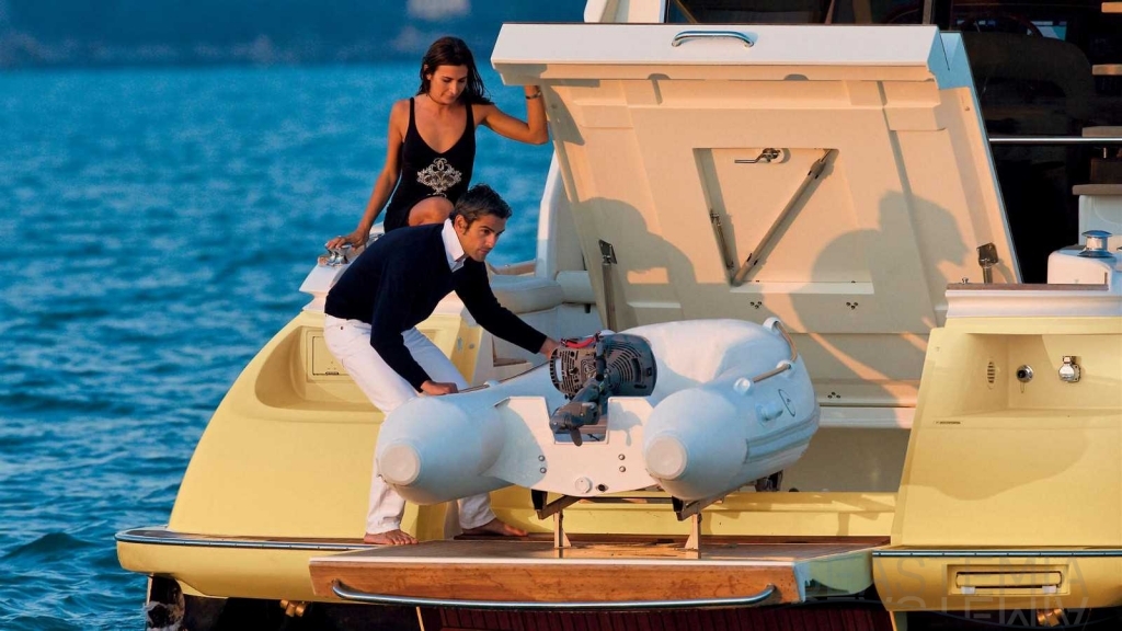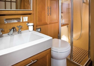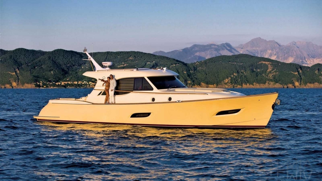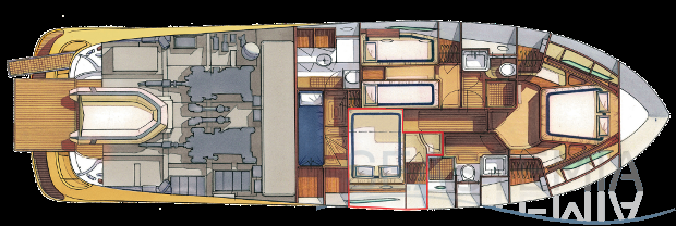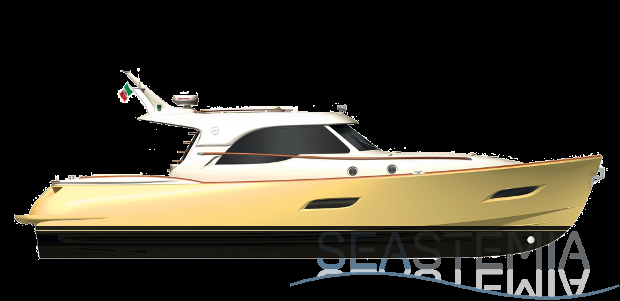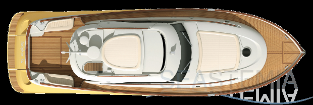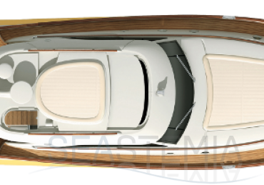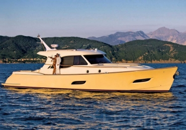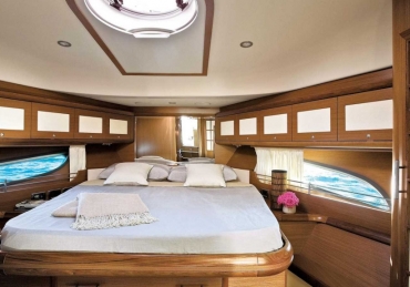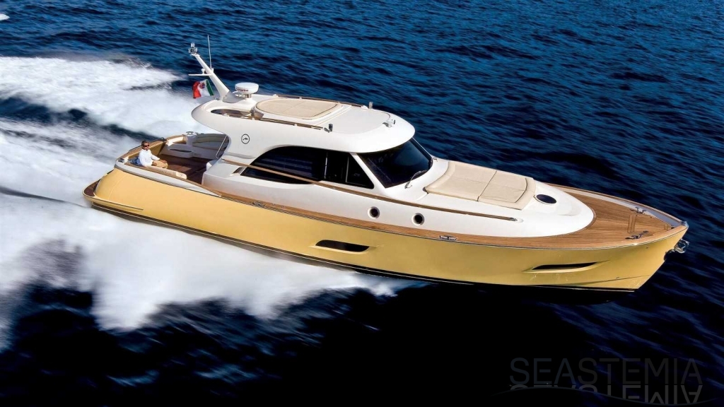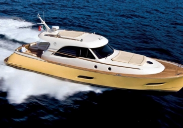 The Dolphin 54’ is offered in a warm yellow colour in sun top or flybridge version for those looking for more direct, harmonious contact with nature. Intelligent reorganisation of its layout means the Dolphin 54’ (16 metres) offers all the light and comfort of a much larger yacht. Its exterior is characterised by the supple lines typical of the Dolphin, the interior by use of solid teak throughout, including all the furnishings. Natural tones prevail in the lounge, with its sensibly and functionally arranged spaces filled with the aromas of wood and leather. On the port side is a large, extendable teak table, and a C-shaped leather couch. The starboard side, on the other hand, houses the galley, with the kitchenette leading directly to the cockpit. The sleeping area on the lower deck houses a large master cabin in the bow, illuminated by the natural light which streams in through the large windows, as well as two guest cabins – one twin, one with L-shaped beds. The pleasant and practical nature of wood accompanies the owner throughout the boat, starting from the welcoming teak cockpit floor with two comfortable couches at the sides, right up to the bow and its spacious sun pads.