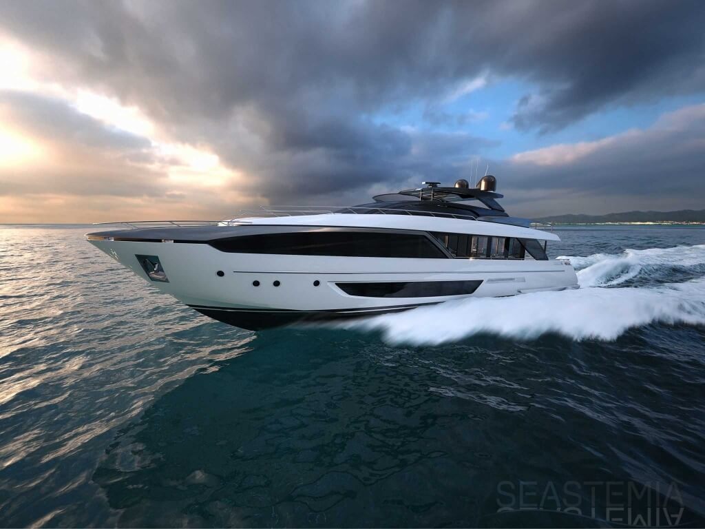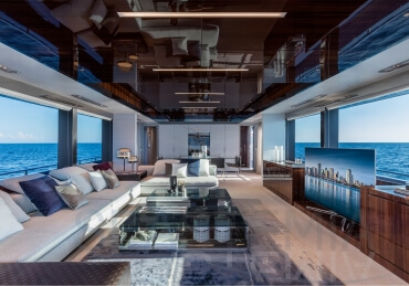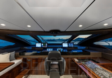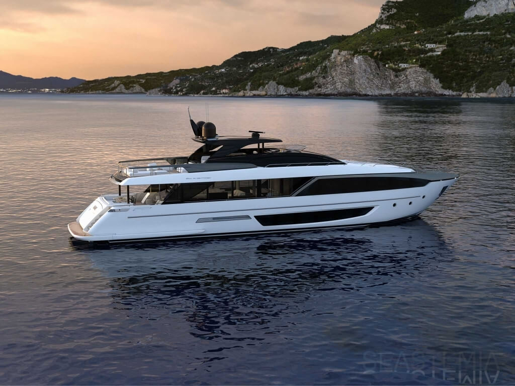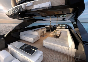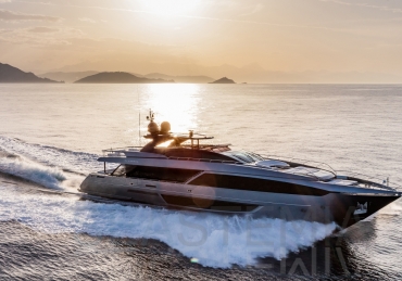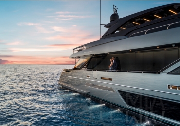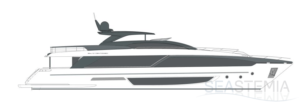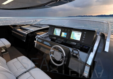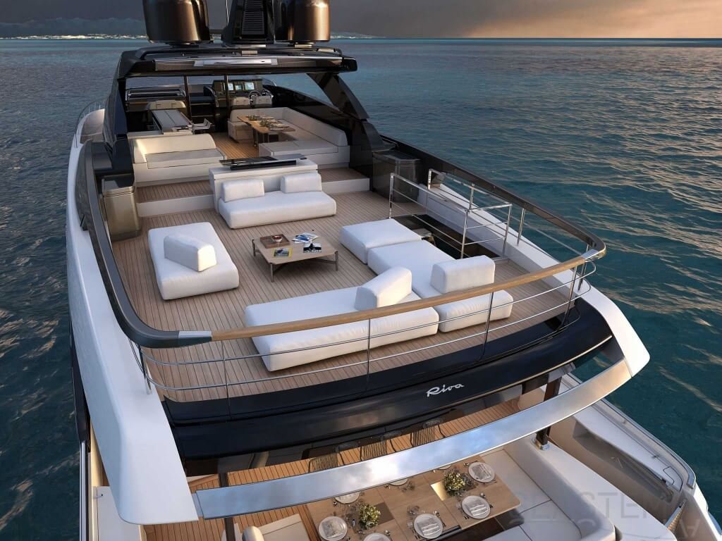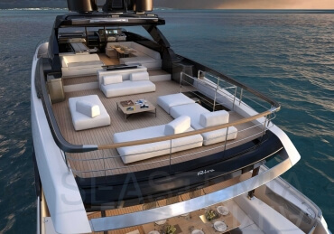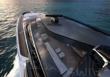 The Riva 110 'project, Riva’s new fiberglass flagship, is a promise of style, design and performance to reach levels never seen before. Through the collaboration between Officina Italiana Design, the studio founded by Mauro Micheli together with Sergio Beretta, the Ferretti Group Product Strategy Committee, and the Engineering Department, Riva 110' promises to be a magnificent and beautiful flybridge yacht, as well as larger than ever before. The completely renewed hull design measures almost 110 feet in overall length, with a beam larger than 11 feet. The exterior design further builds on the flowing lines of the 100' Corsaro. Characterized by a super sporty profile, the Riva 110' exhibits a large window in the hull with integrated porthole and, on deck, a long glass ceiling that stretches along the entire living room and it is formed by glass framed in stainless steel. The aft is equipped with the innovative Submersible Hatch, the exclusive movement system that Ferretti Group has patented, which has already convinced experts and triumphed