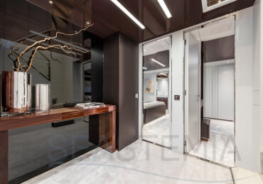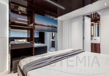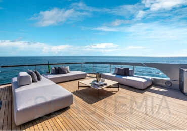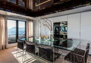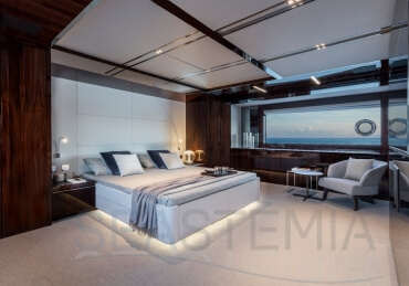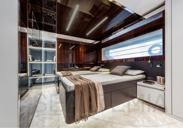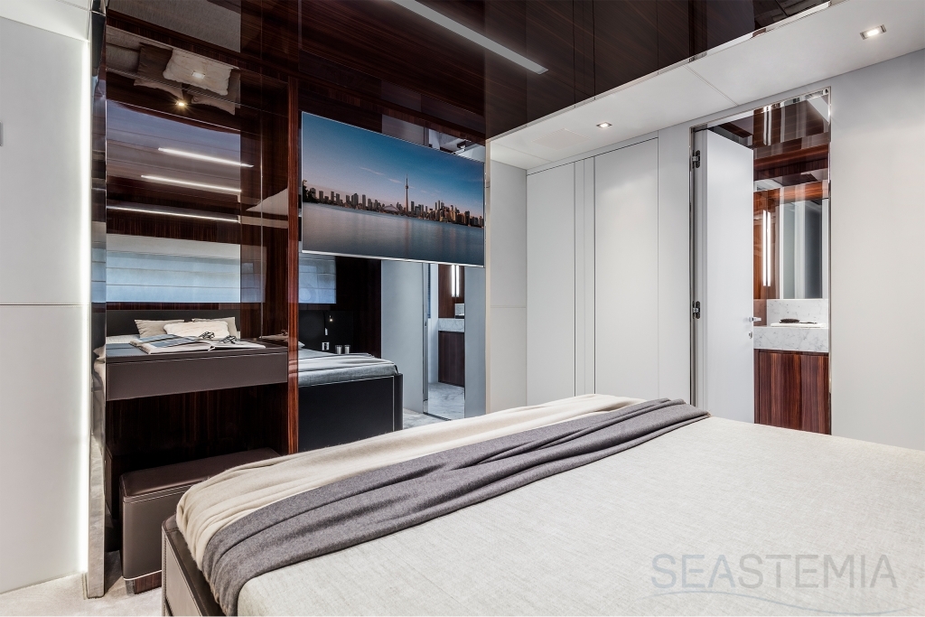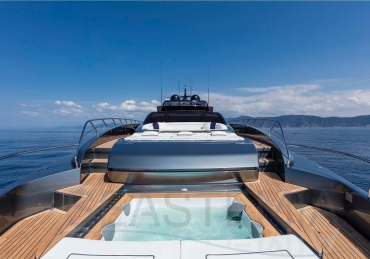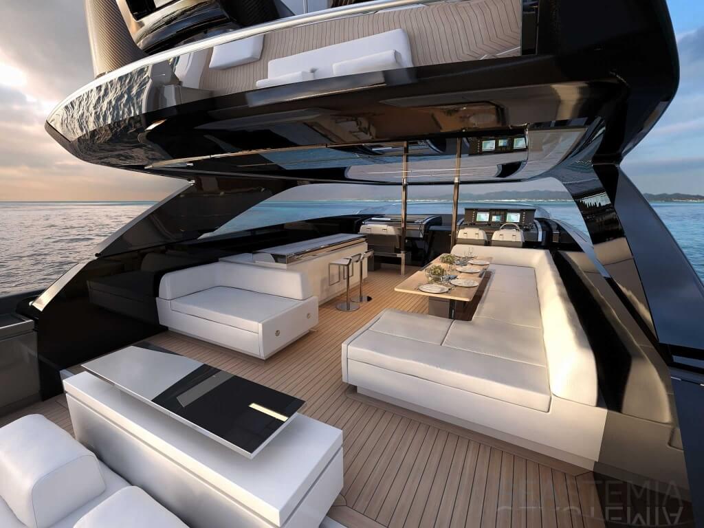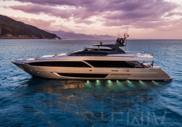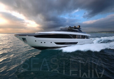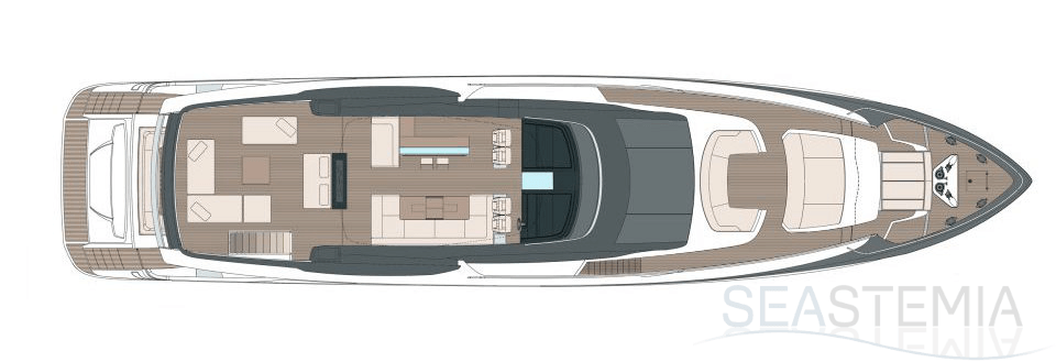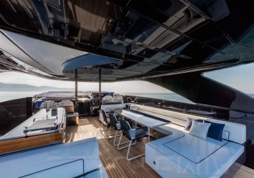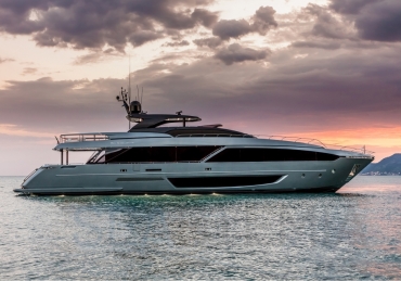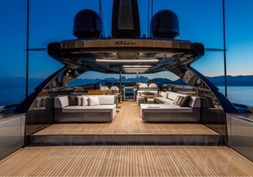 The Riva 110 'project, Riva’s new fiberglass flagship, is a promise of style, design and performance to reach levels never seen before. Through the collaboration between Officina Italiana Design, the studio founded by Mauro Micheli together with Sergio Beretta, the Ferretti Group Product Strategy Committee, and the Engineering Department, Riva 110' promises to be a magnificent and beautiful flybridge yacht, as well as larger than ever before. The completely renewed hull design measures almost 110 feet in overall length, with a beam larger than 11 feet. The exterior design further builds on the flowing lines of the 100' Corsaro. Characterized by a super sporty profile, the Riva 110' exhibits a large window in the hull with integrated porthole and, on deck, a long glass ceiling that stretches along the entire living room and it is formed by glass framed in stainless steel. The aft is equipped with the innovative Submersible Hatch, the exclusive movement system that Ferretti Group has patented, which has already convinced experts and triumphed