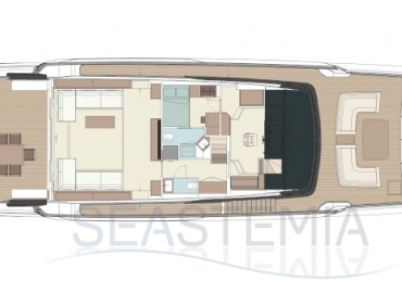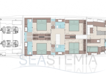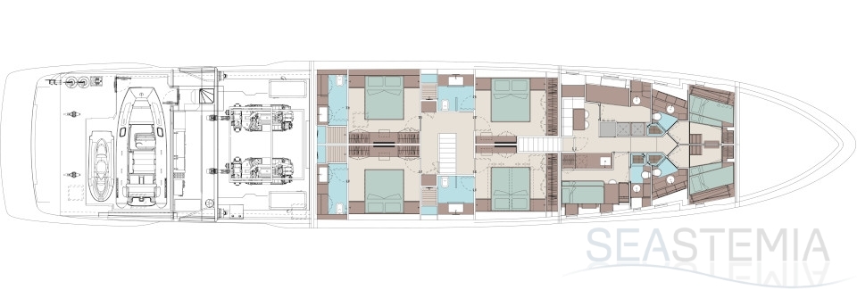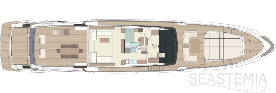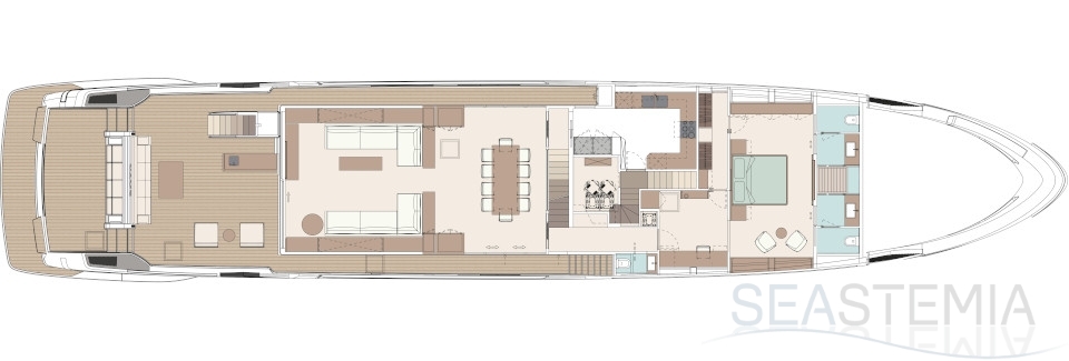 The flagship’s exteriors introduce a new concept for the stern area, which is lower, open to the water, and divided into a large Beach Club and a generous cockpit: over 60 square metres of liveable space. The jet ski, tender and seabob are stored in the port hull side. In the bow, the owner is accommodated in a spacious area divided into a lounge, a large sun pad and other more intimate, private spaces. On the upper deck - where the outdoor area in the stern is set up as a dining area seating ten - the side walkways create two closed, private balconies. Above this is the sundeck, an area where guests can be invited for cocktails in a relaxing atmosphere.