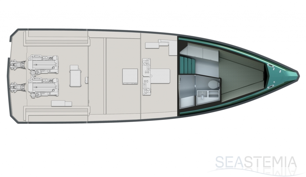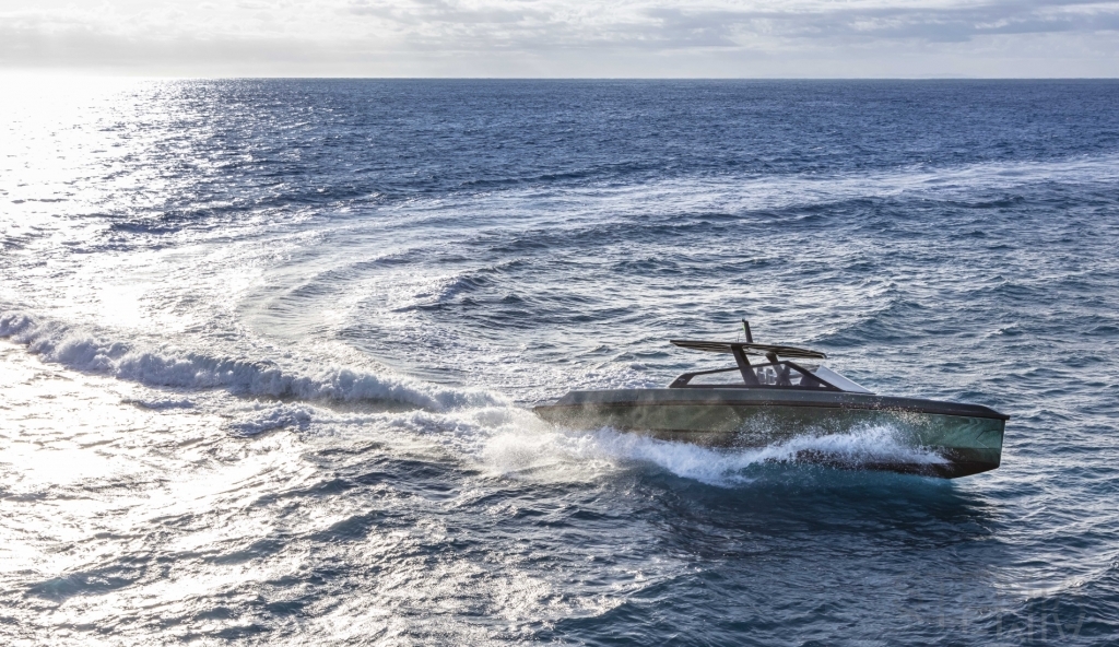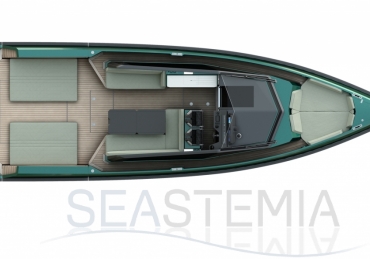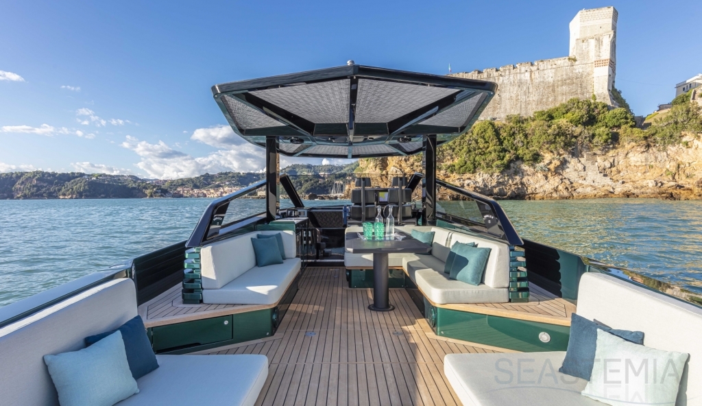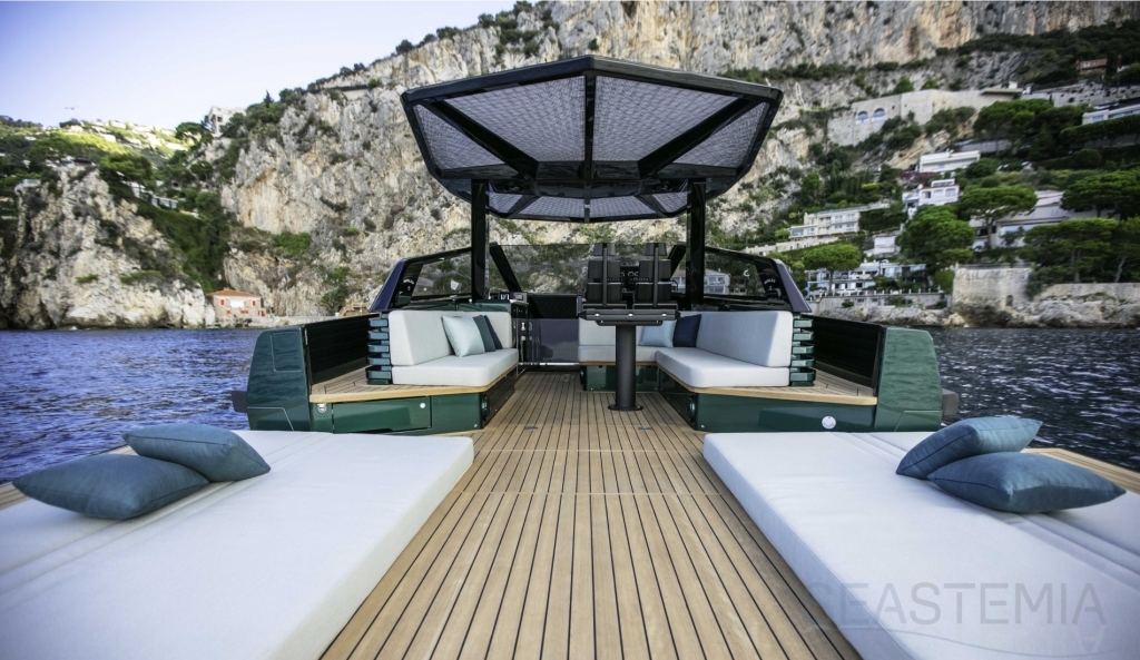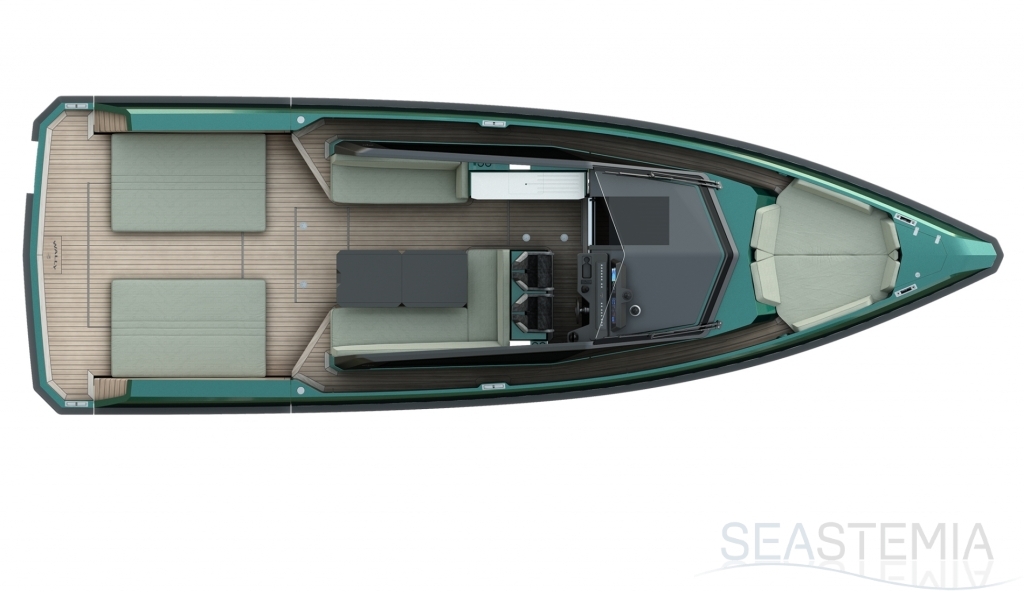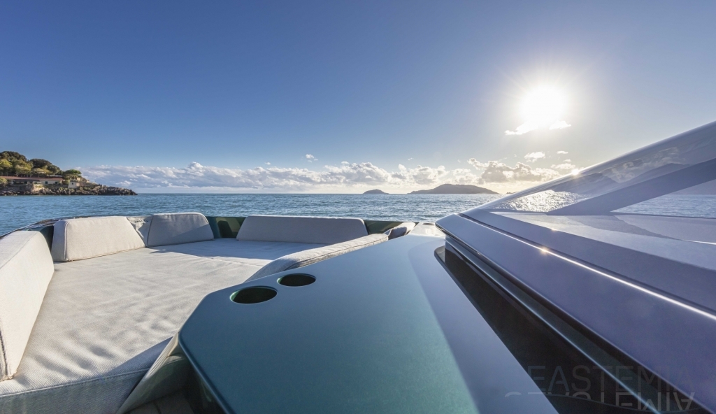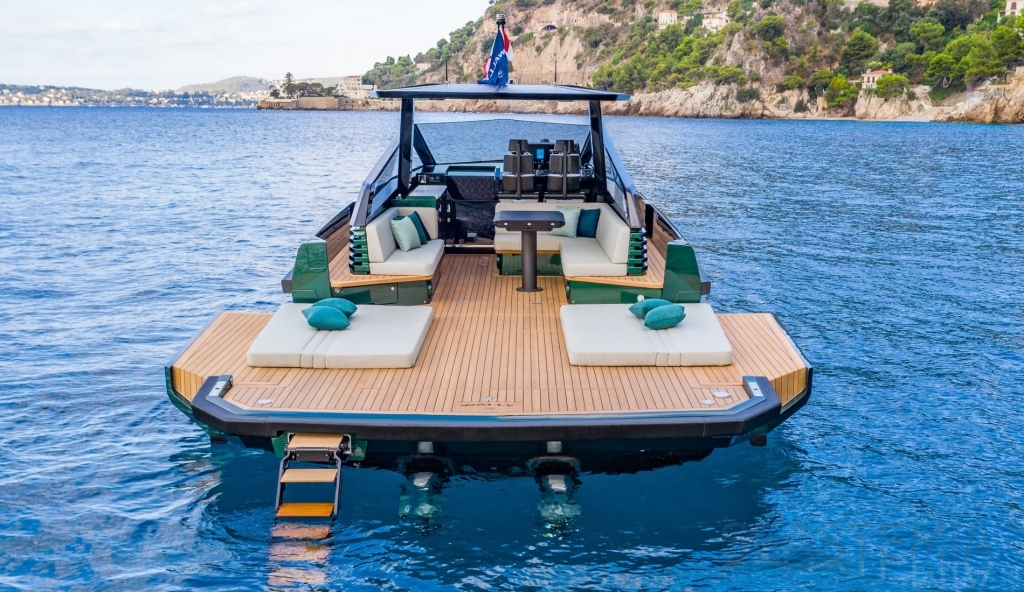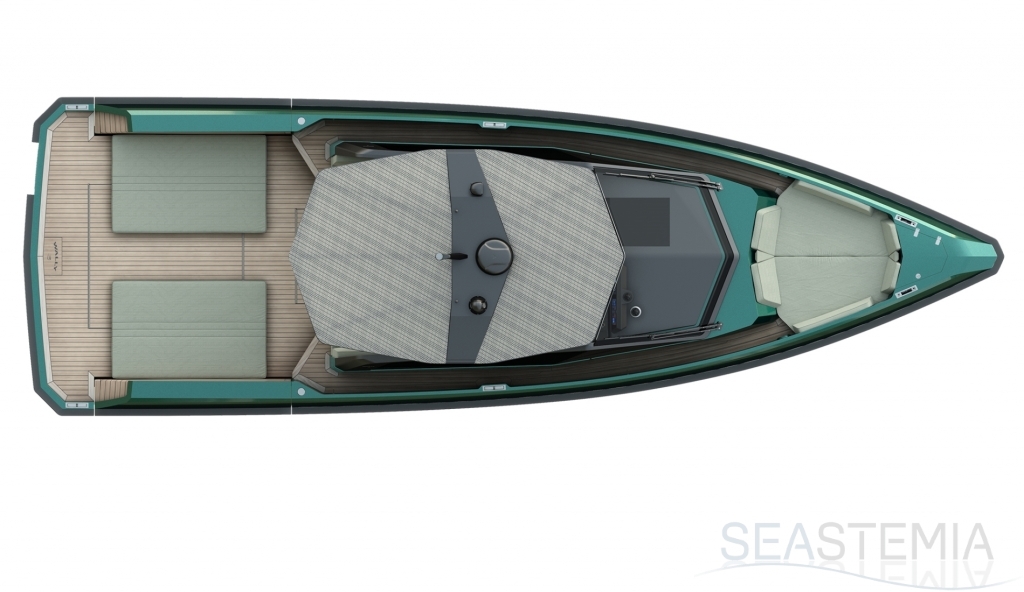 Abundance of standard design features: side-opening bulwarks, T-top carbon fiber superstructure with laminated sail cloth, carbon fiber swimming ladder, wraparound glass windshield, concealed hydraulic push-button anchor system, teak decking, wraparound fender, flanking walkways, large foredeck sunpad, fold-out dining table, plenty of seating, fridge, insulated ice box locker, LED deck lighting, generous bathroom facilities with separate shower compartment, cabin with bed, unique head-turning colors.