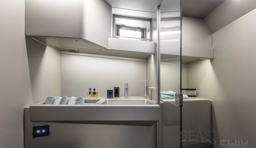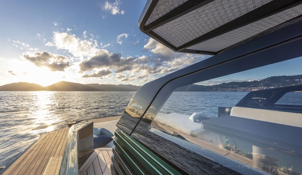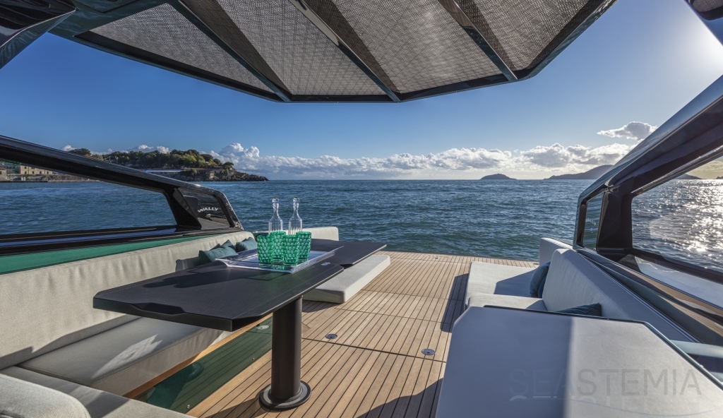 Options include raised aft sunbed with garage for watersport accessories, second larger fridge, ice maker, diesel generator, air conditioning both inside and outside in the cockpit area, SeaKeeper stabilizer system, automated retractable swimming ladder/passerelle.