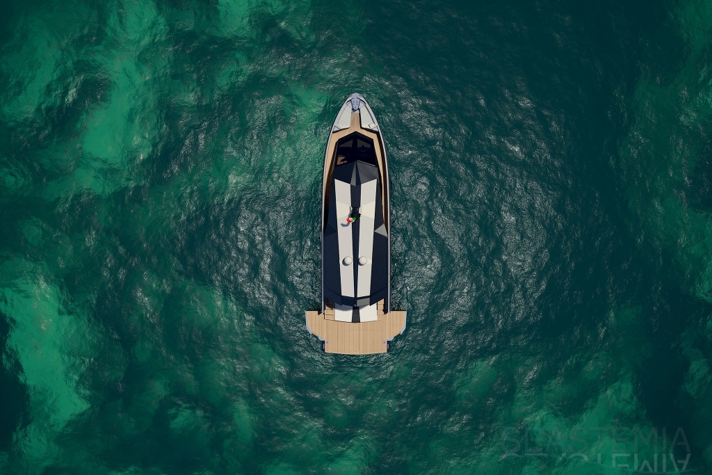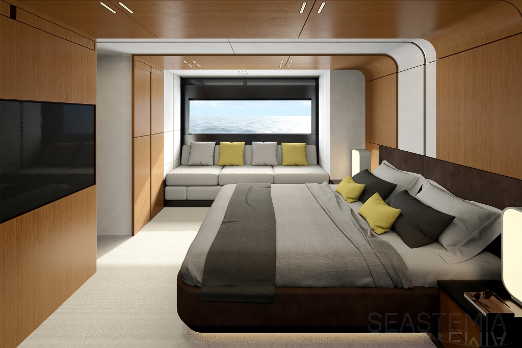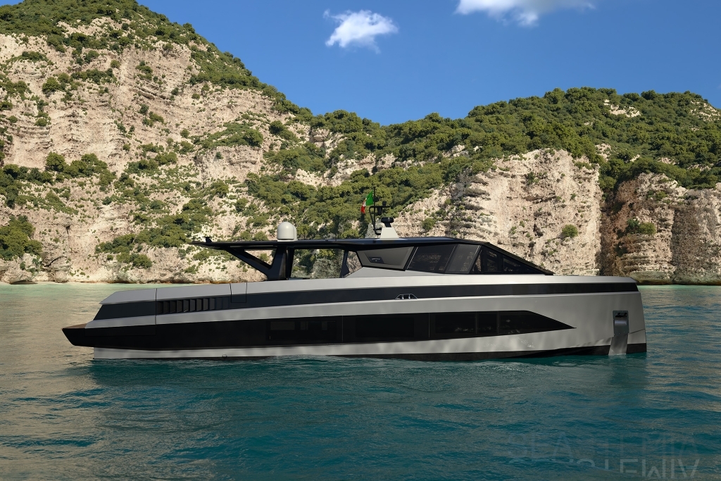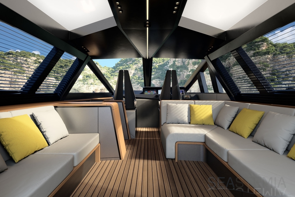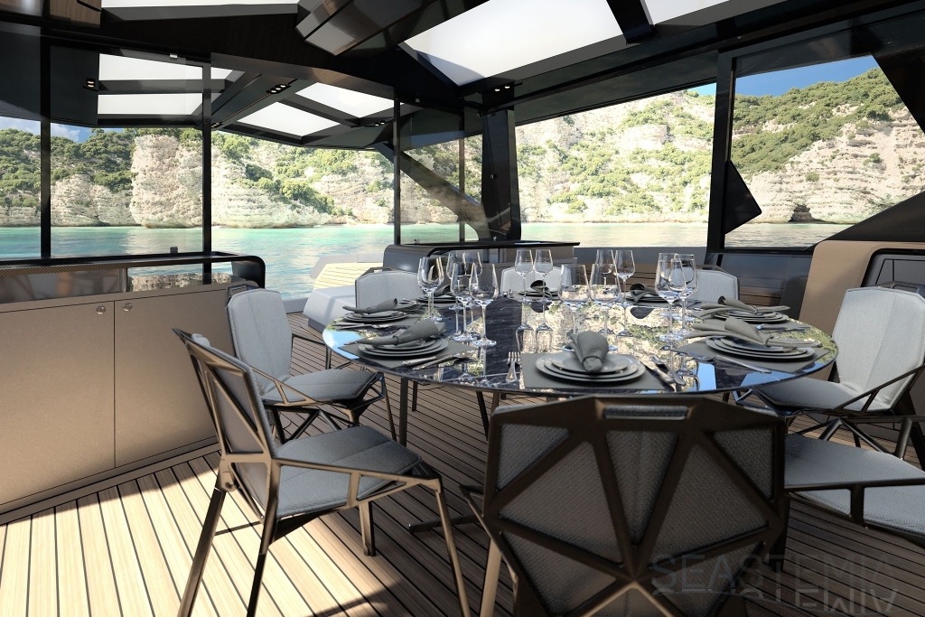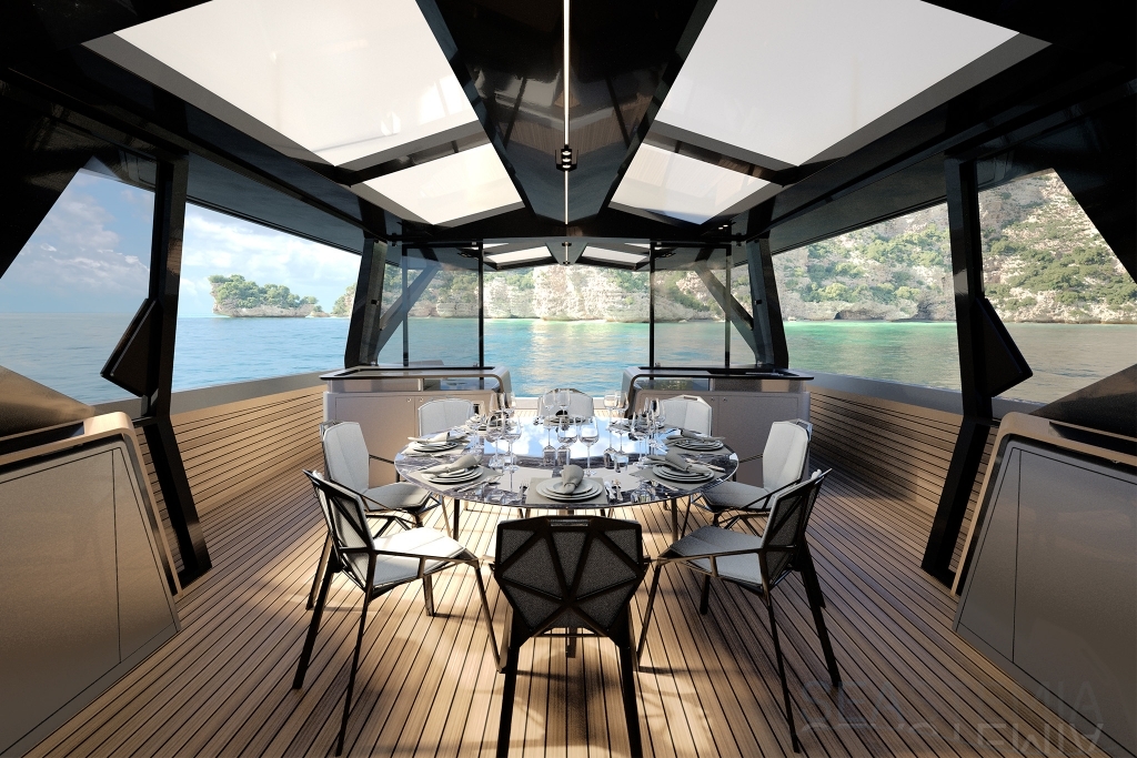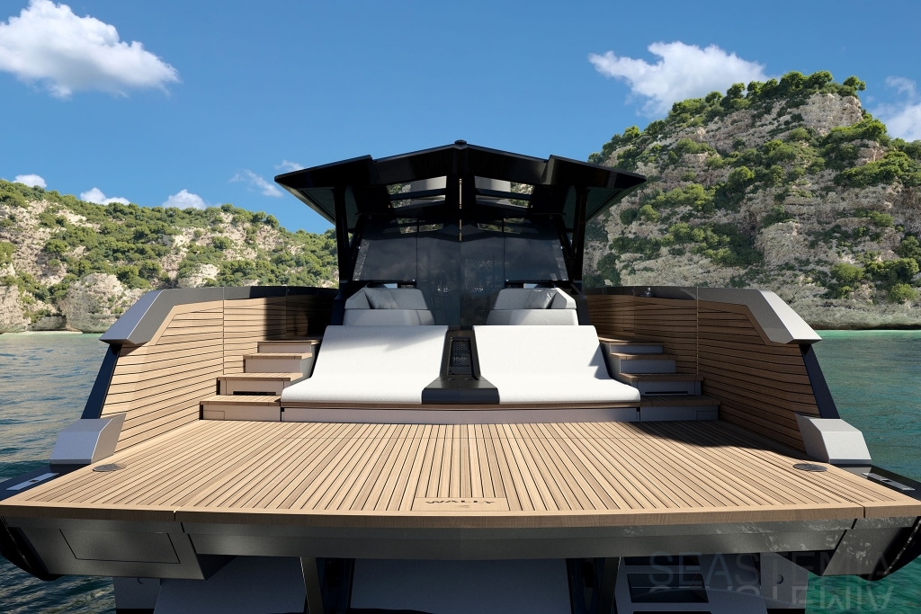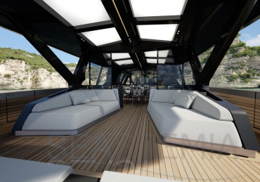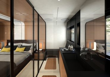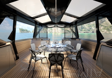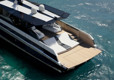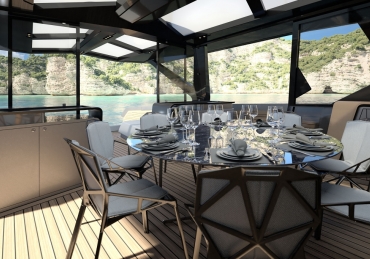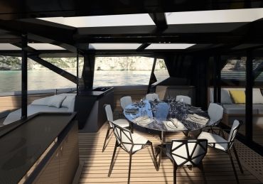 At its core is a single flush deck running from bow to stern. Chameleon-like, it adapts stylishly to different occasions thanks to a hybrid inside-outside concept. There’s dining for six, two chaises-longs, a bar and a galley, where the interplay between opening sides and aft doors can completely alter the ambiance. The wheelhouse can be easily closed off and the cockpit turned into a cosy movie lounge.