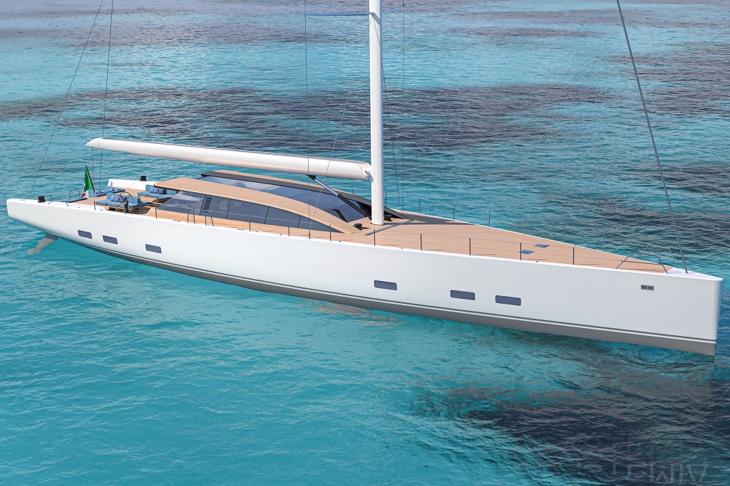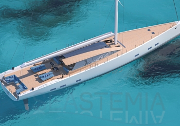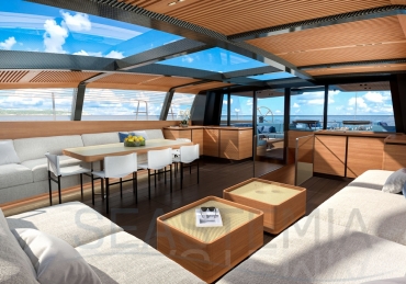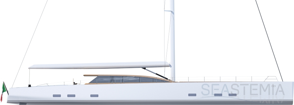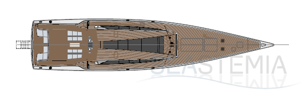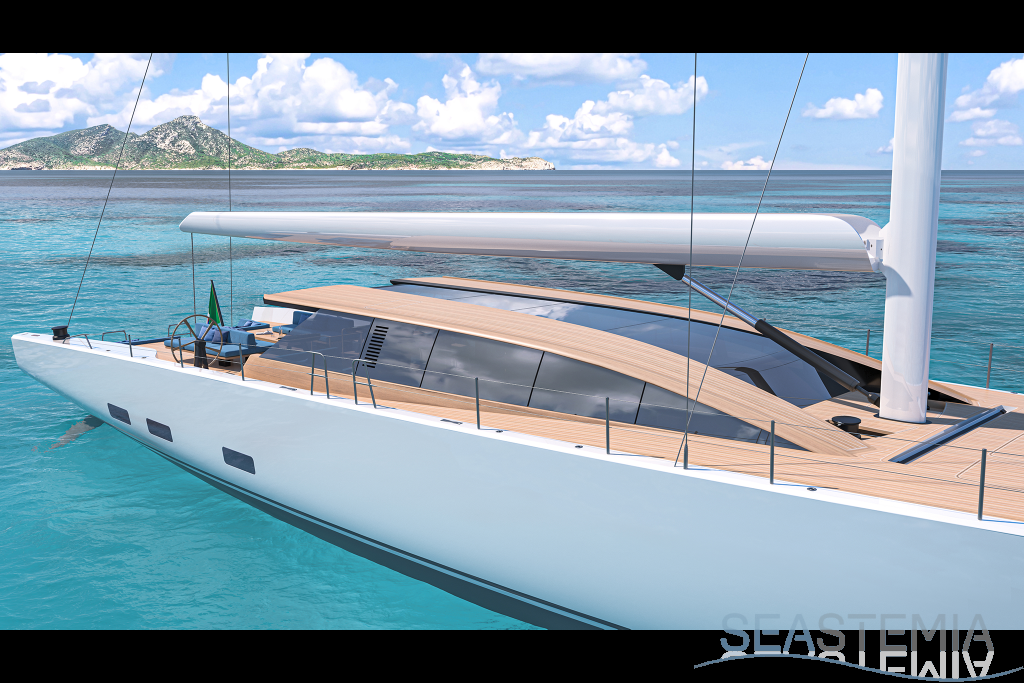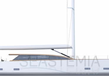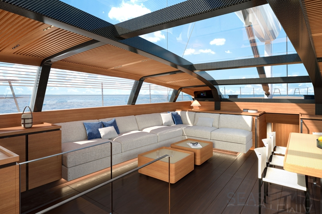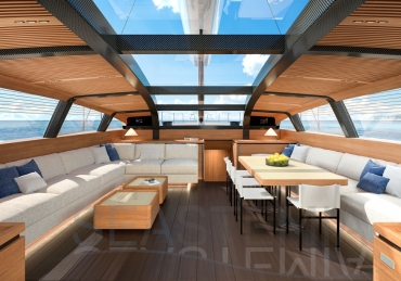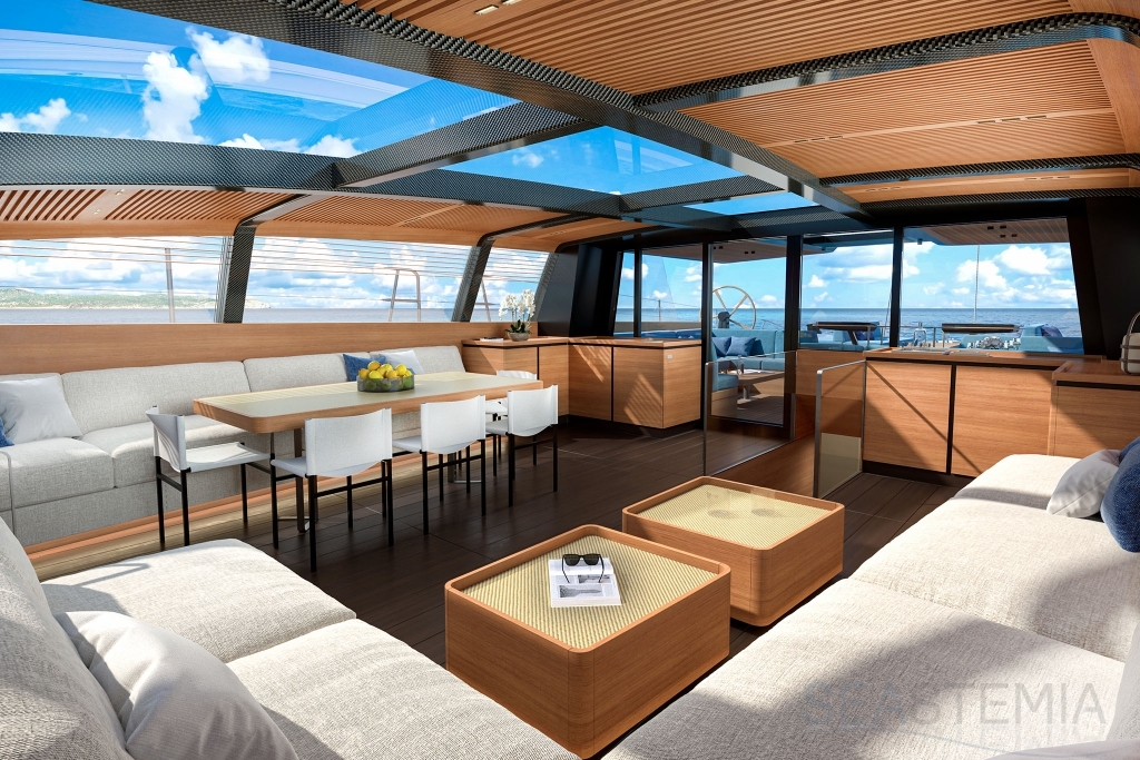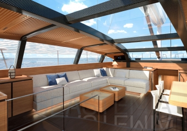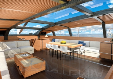Her full 130ft length makes it possible to introduce a two-level living concept, with the main saloon at deck level and the cabins below. The lightweight carbon deckhouse is glazed on every side, maximising the potential light and dramatic sightlines. The full-length skylight also makes it easy to keep an eye on the sails.