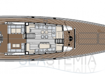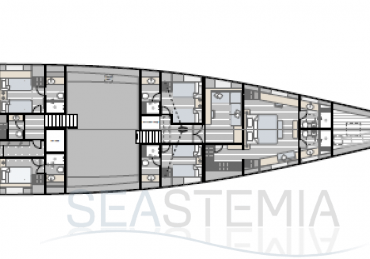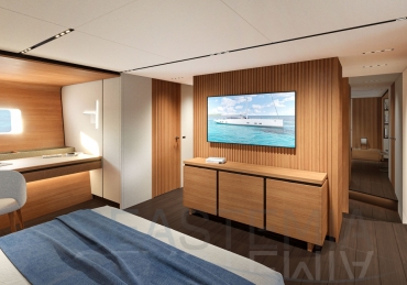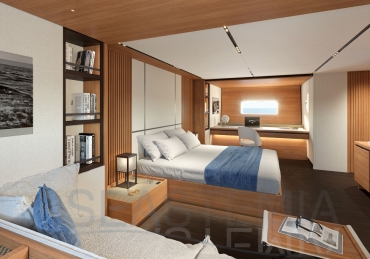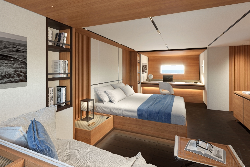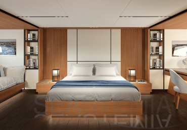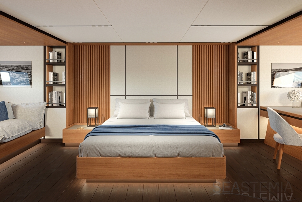 Choose where to put the owner’s suite, with its private salon and his n’ hers bathrooms: forward for ultimate privacy or aft to benefit from the full beam. There are three other guest cabins, all with ensuite bathrooms and storage reminiscent of an even larger yacht.