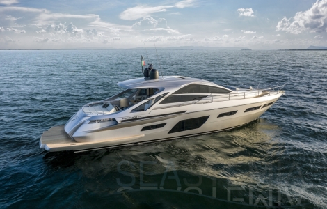 The spatial ergonomics is maximal thanks to volumes that blend technology and performance in perfect proportions. The open spaces allow the boat to be filled with pleasure and light, such as the large lounge characterized by the front openable windows and the dark glass sliding roof. The new, much larger rectangular portholes allow air and natural light to permeate the rooms below decks.