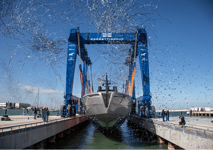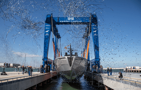 The wait is over: the first aluminium superyacht by Pershing has hit the water at Ancona's Super Yacht Yard on 23 February.