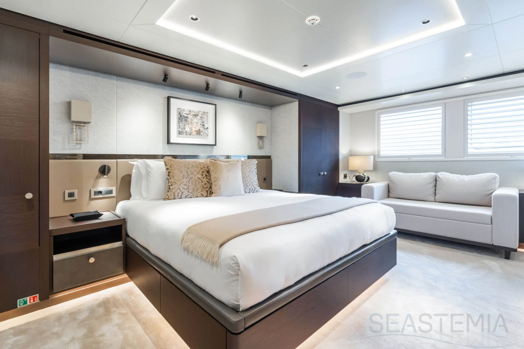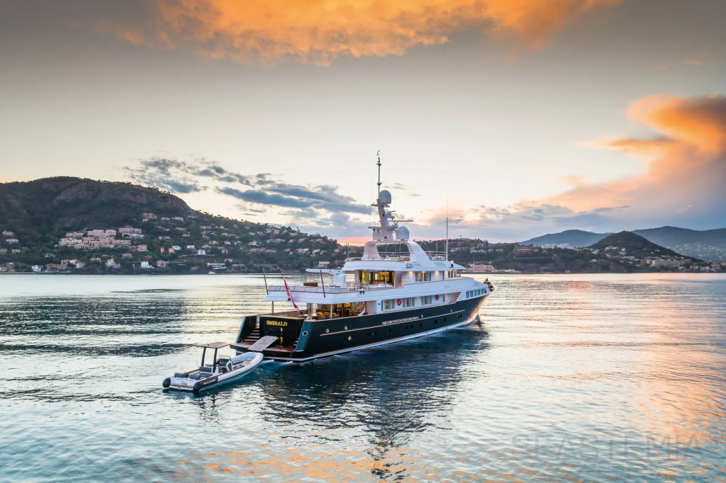 She has a top speed of 14 knots and cruises at 12 knots, with a maximum range of 4,500 nautical miles at an 11-knot cruising speed, powered by two Detroit Diesel engines. The yacht can accommodate up to 14 guests across 7 staterooms, with a crew of 12. EMERALD has a gross tonnage of 467 GT and an 8.2-meter beam.