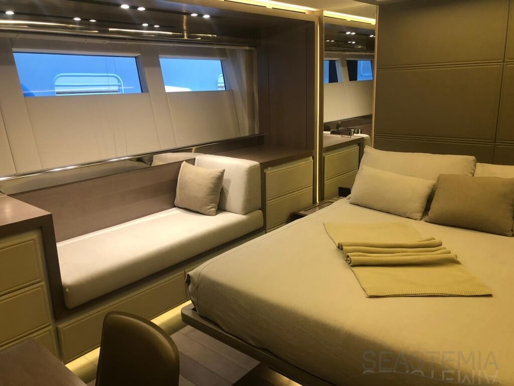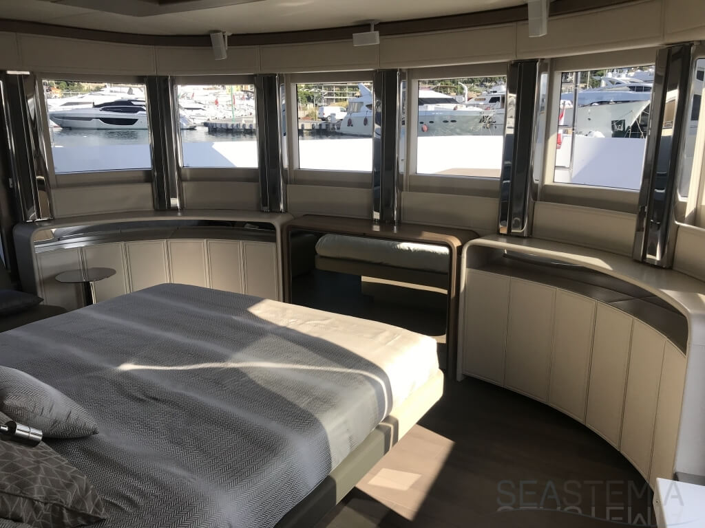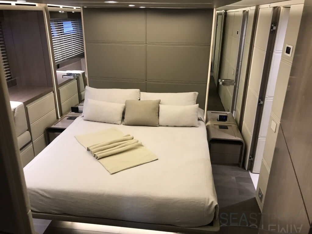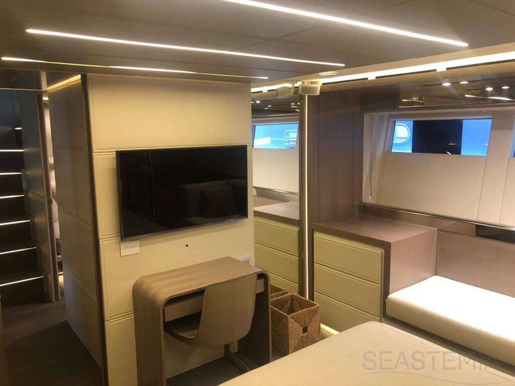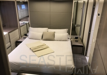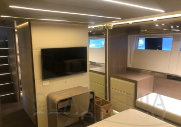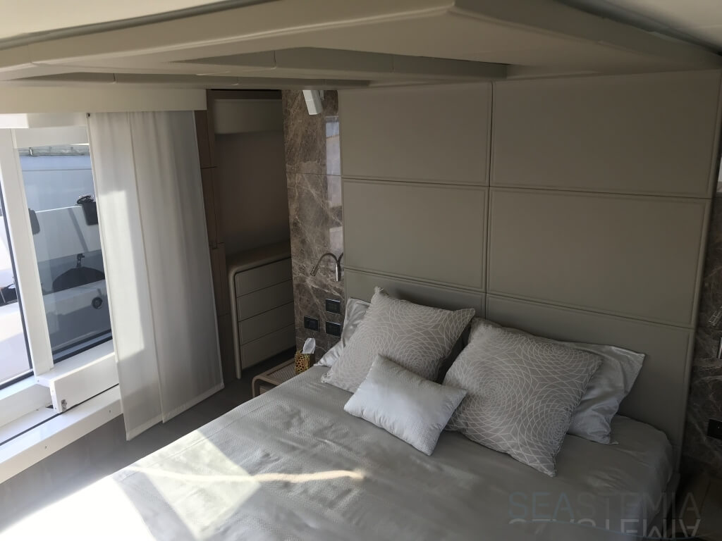 Second owner since new, this 4 cabins layout unit with a panoramic Master ensuite on the main deck, and a second full gauge "Master/VIP" cabin in the lower deck and two additional twins. All cabins are euipped with wardrobe and bathrooms to accomodates comfortably 8 guests on a long cruise, in the nicest light luxrury atmosphere of T4 Design.