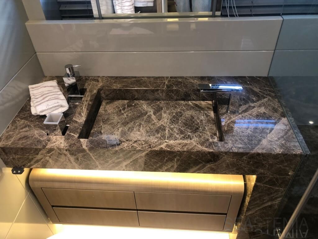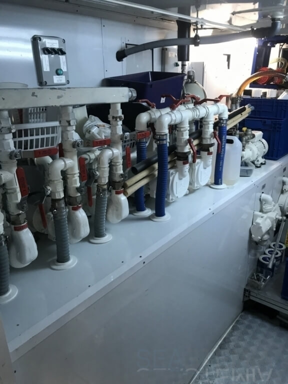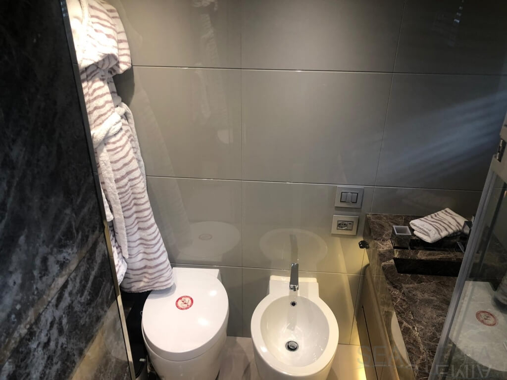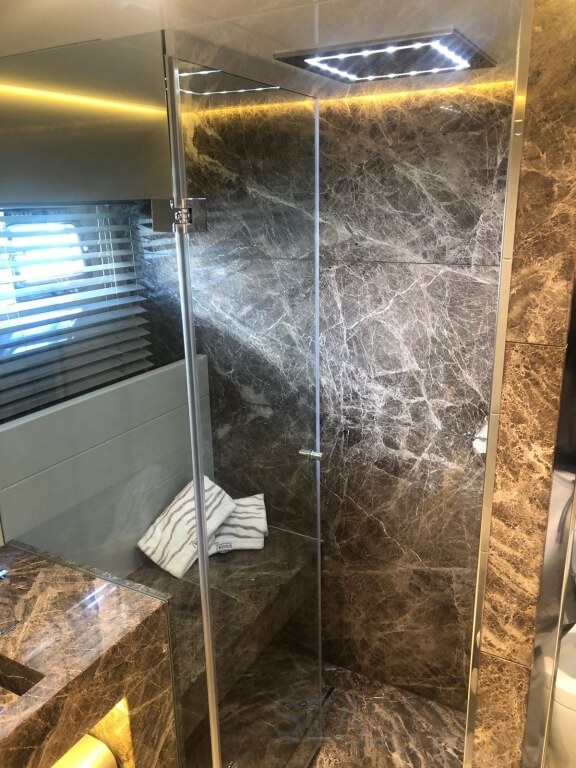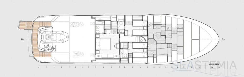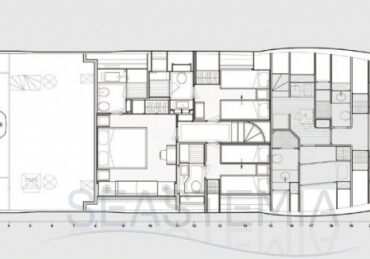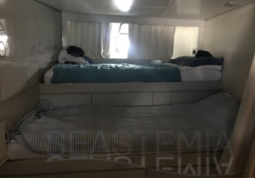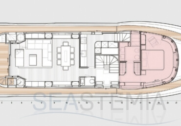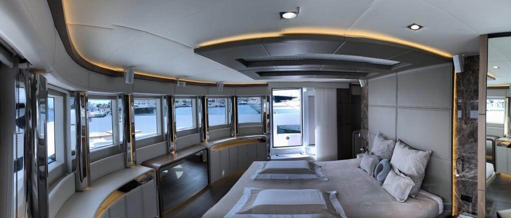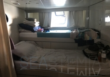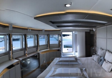 Second owner since new, this 4 cabins layout unit with a panoramic Master ensuite on the main deck, and a second full gauge "Master/VIP" cabin in the lower deck and two additional twins. All cabins are euipped with wardrobe and bathrooms to accomodates comfortably 8 guests on a long cruise, in the nicest light luxrury atmosphere of T4 Design.