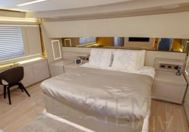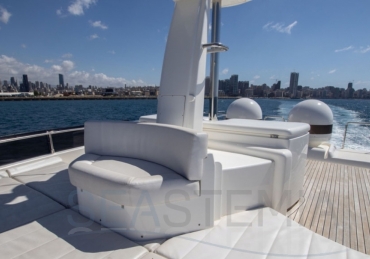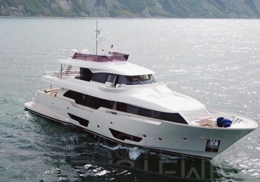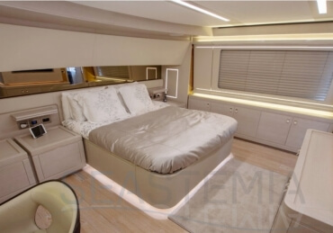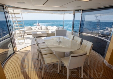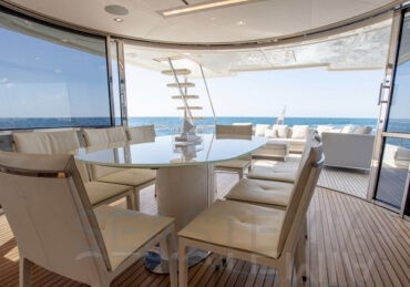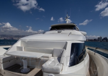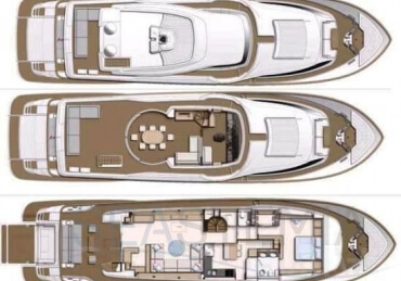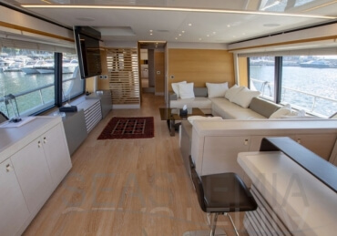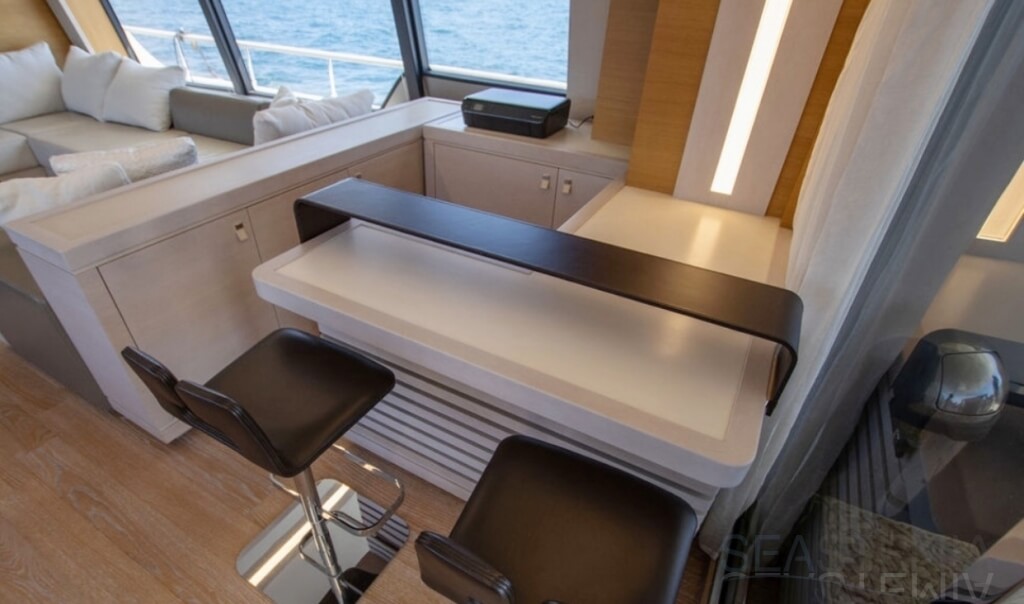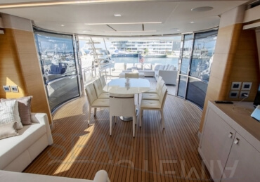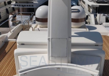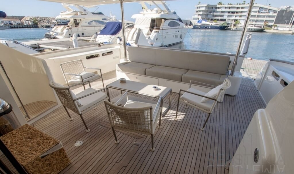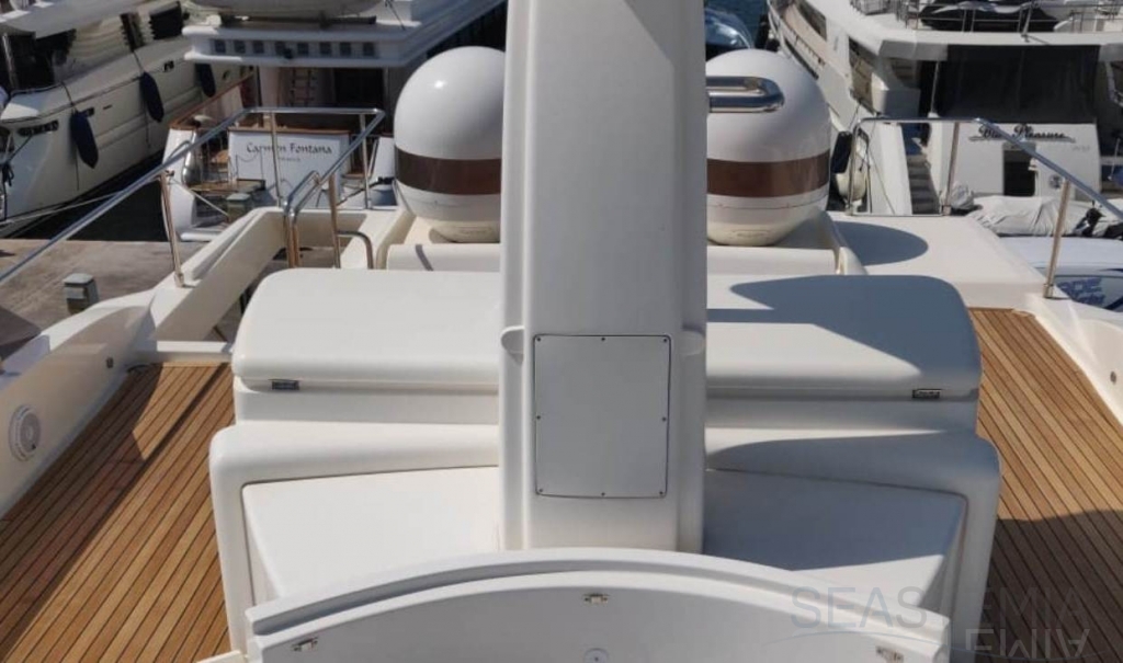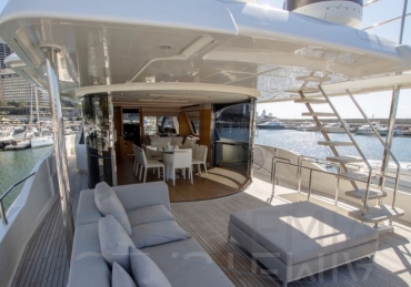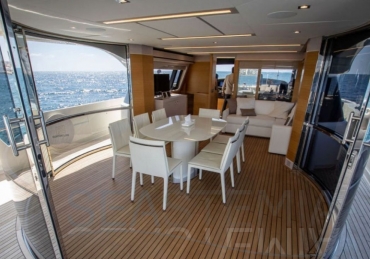 The FERRETTI CUSTOM LINE NAVETTA 28 is recognizable from the unmistakable exterior profile and the panoramic dining area with round glass sliding doors which allow for great flexibility in the use of the upper deck. The sundeck comprises a large sunbathing area and awning.