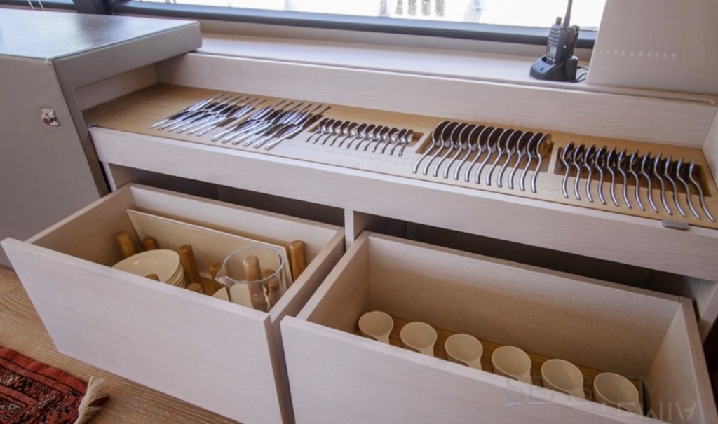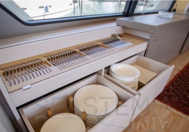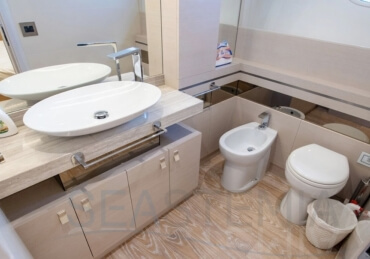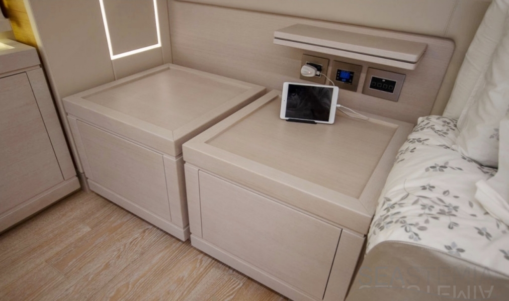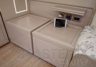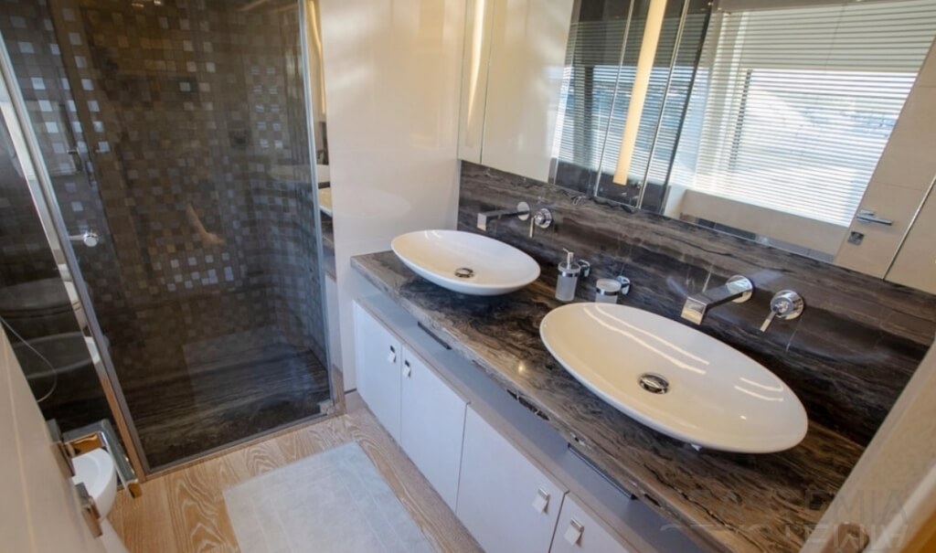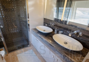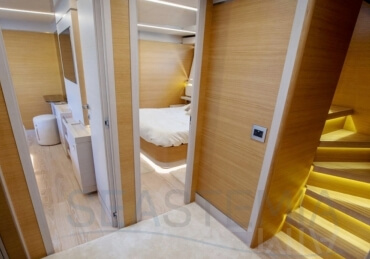 When guests walk into the salon, they are welcomed by a large, carefully structured open space. To Starboard you have the galley, towards the bow, you reach the area reserved to the ship owner’s master stateroom with a large bathroom and walk-in wardrobe. She can comfortably accommodate up to 10 guests in 5 luxury en-suite cabins with 5 crew members in 3 additional cabins with separate access.