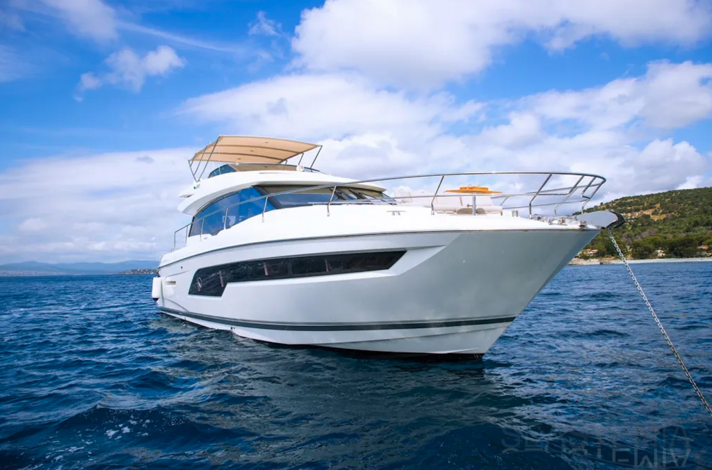 This vessel is powered by twin Volvo IPS 950 engines (725 HP each) with joystick control, and features a 3-cabin layout accommodating 6 berths. It’s equipped with a Seakeeper gyroscopic stabilizer for optimal navigation. The interior boasts grey oak woodwork, complemented by Casamance Platine upholstery.