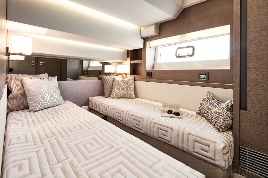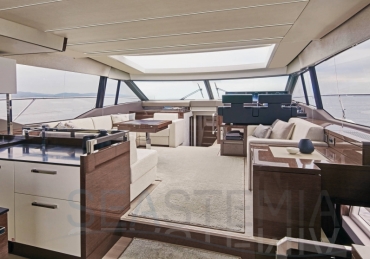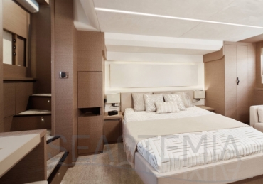 The onboard space is optimized with various amenities such as an ice maker in the cockpit, a 5 kg washer-dryer, a dishwasher, air conditioning for the crew cabin, a Greco Black laminate countertop in the galley, and a crew cabin equipped with a WC and shower. The salon features a luxury electric table, with teak flooring on the sportfly and brushed Wengé floors in the entrance and salon.
