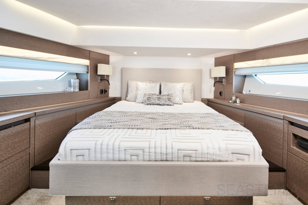 Among the numerous features are a complete electronics package, a Bowers & Wilkins audio system, an electric capstan for portside aft mooring, a sportfly protective cover, an electro-hydraulic sportfly bimini, an integrated hydraulic telescopic gangway, a hydraulic swim platform, and underwater lights.