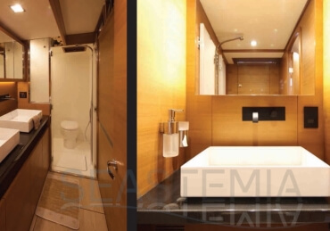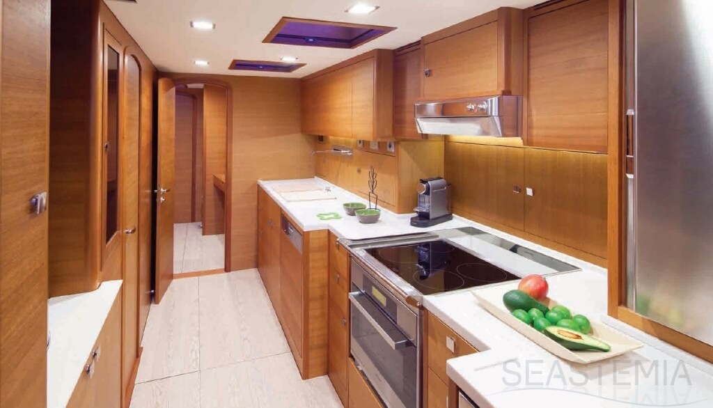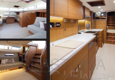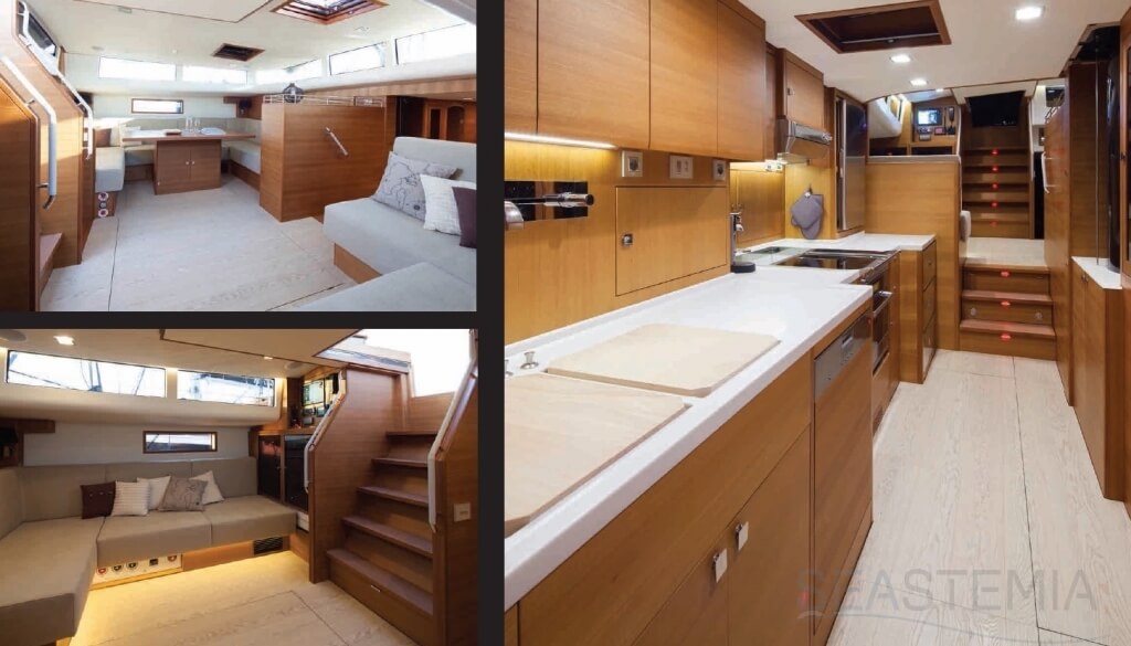 Deckhouse with living room and navigation corner. 3 bedrooms: 1 Master bedroom with king size bed, 2 generous guest cabins with numerous storage spaces and all the bedrooms with ensuite shower rooms. Fully equipped galley