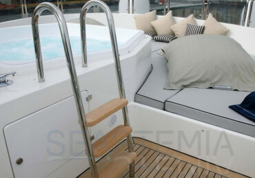 SATINE captures timeless Benetti styling, while packing the amenities of a 40m yacht into that of a 35m. A rare find for yachts in this size range is the relaxing sky lounge, featuring a second bar and day head. The main deck features a full beam Master stateroom, a large saloon and dining room, separated by a bar for entertaining. A full beam VIP stateroom and 2 twin staterooms are located on the lower deck.