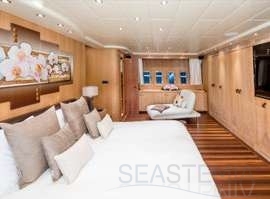This luxury Mangusta 108 provides a generous accommodation for up to 8 guests in 3 staterooms: a master cabin, a VIP cabin, one double cabin and a lounge area. You will appreciate her elegant lines and the interior that combines a modern and sophisticated atmosphere, with plenty of natural light during the day and refined illumination. With a modern sound system, this exclusive yacht is designed to bring you amazing experiences during all kind of celebrations.