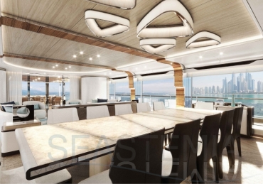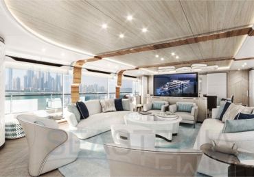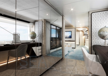 Her opulent exteriors feature an incredibly expansive sun deck, infinity pool, a hybrid beach club, fold-down balconies, and a swim platform providing guests unprecedented ease of access to the water. Her smart layout can accommodate up to 12 guests across its seven lavish staterooms, and can also host a crew of up to nine members with five large crew cabins and private captain’s accommodation.