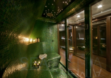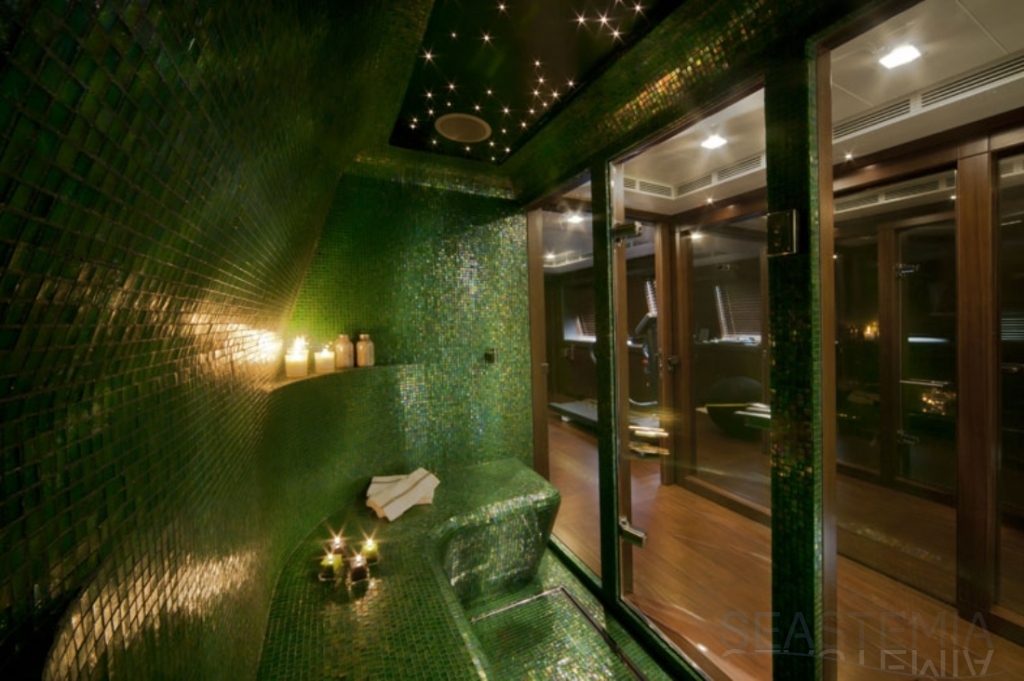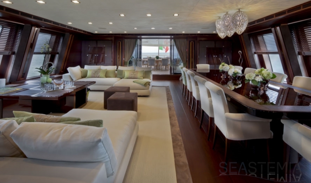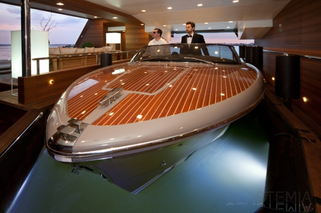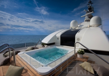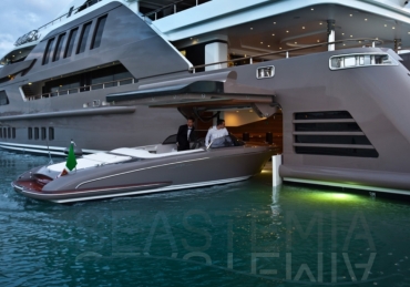 An innovative solution with a floodable floating dock on the port side that becomes a swimming pool that together with the indoor-outdoor area of the beach club create an extraordinary open air living area at sea level.