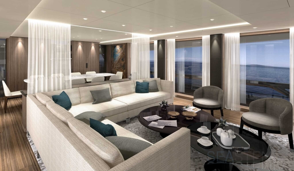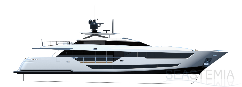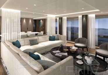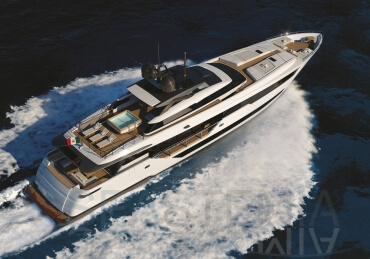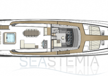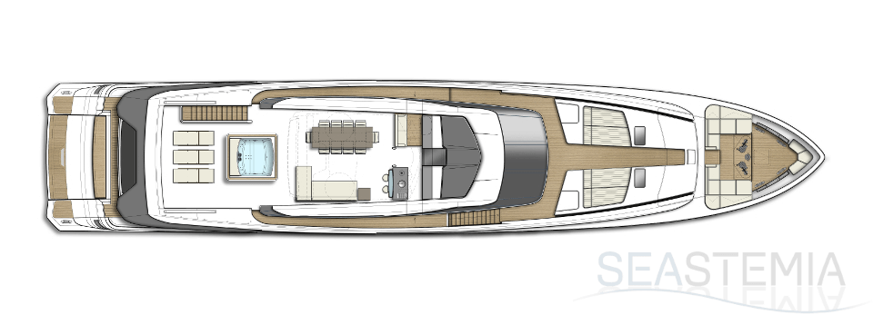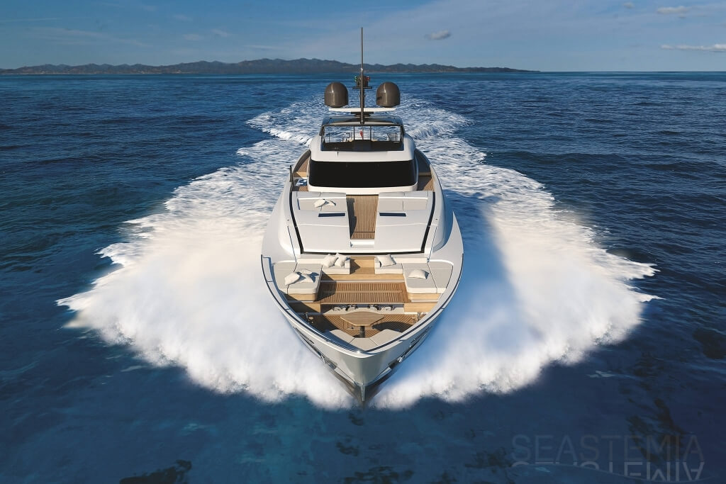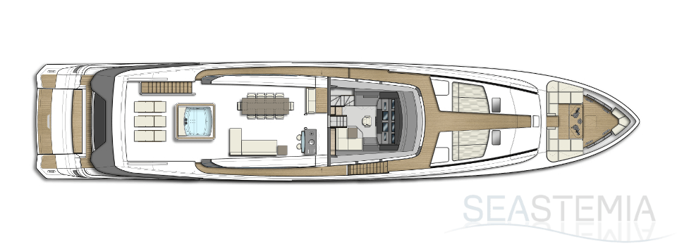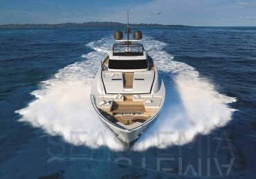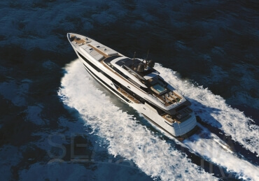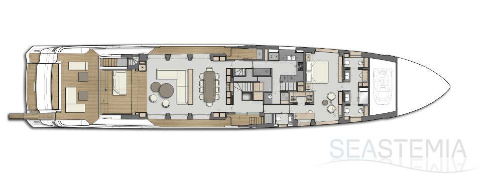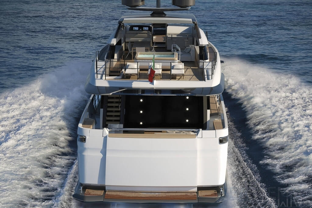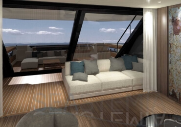 Custom Line 120’, the new jewel of the series and the first Custom Line planing yacht designed by Francesco Paszkowski Design, is a collaboration between the Milanese architect’s studio, the Ferretti Group Strategic Product Committee and Engineering Department. The Custom Line 120’ reimagines and combines many stylistic elements, even from automotive design and residential architecture, adding thorough research to bring out shapes and volumes, through layout choices in line with the most recent trends in contemporary living. As is tradition, everything is personalized to the owner’s wishes, because a Custom Line yacht represents those who live onboard. Totally new is the design of the hull shapes and lines, which will be realized by infusing and assembling the built structures together, to ensure maximum strength and lightness, thanks to the use of carbon. The project proposes an aesthetic standard with maximum formal simplicity that creates a unique example of the exterior design and interior settings. The profile is sleek and powerful: strong lines running from bow to stern, giving life to an exciting scene of alternating materials and colors of structural materials and the dark tinted windows; to the cockpit cover and the hardtop, both in metallic gray, give a more aggressive and dynamic look even while in port or at anchor. The windows in the hull are large and generous, while on deck the windows are floor to ceiling and create direct contact with the sea thanks to the pulpits which replace traditional gunwales. The cockpit design is striking with its contemporary style, thanks to the innovative large window that is divided in two sections and can be opened separately. Another prominent innovation is the elevation of the superstructure. This height difference, compared to the bridge, allows for an unparalleled view from the raised salon. The side windows, which are slightly curved, enhance the feeling of living close to the sea.