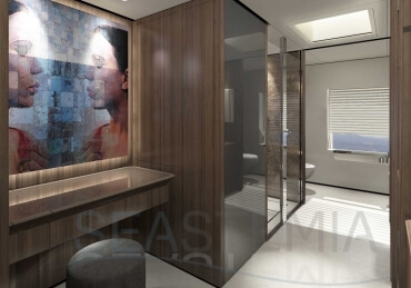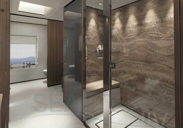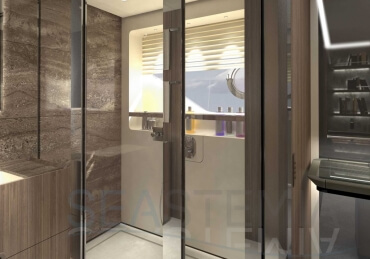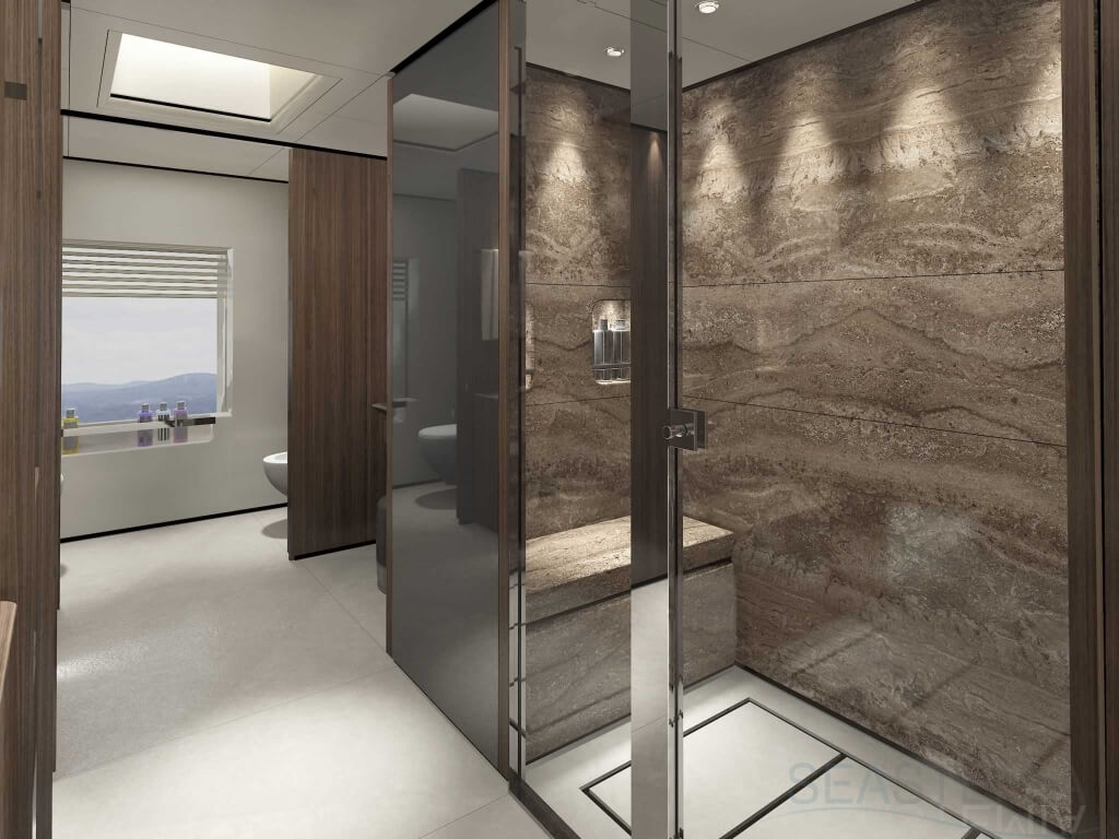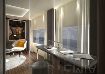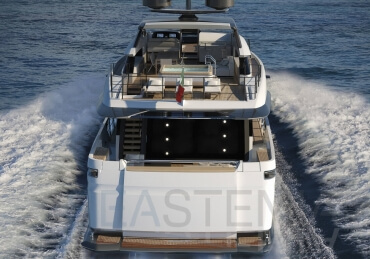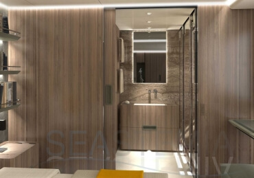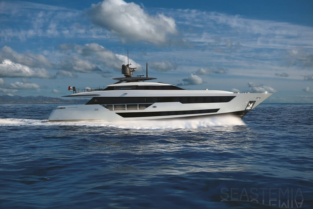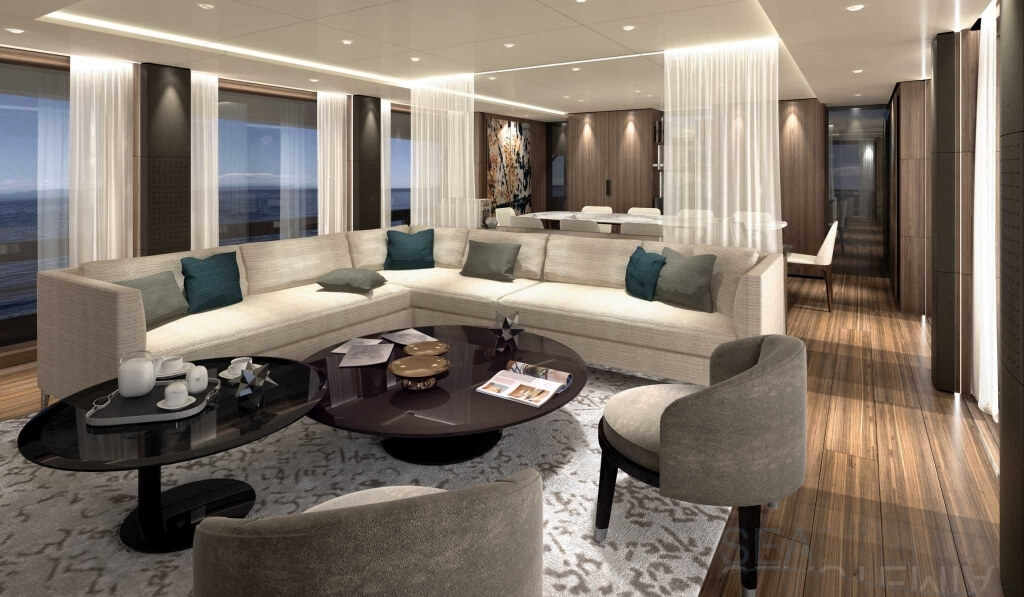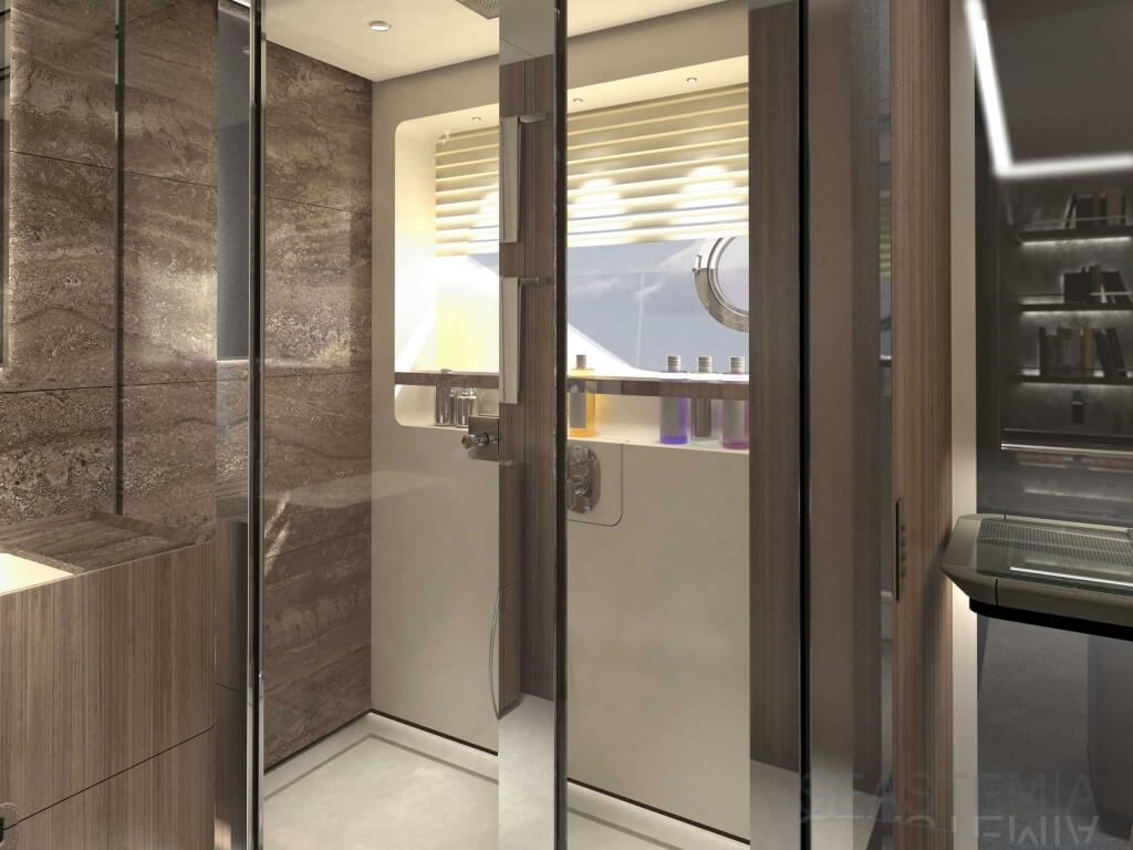 Custom Line 120’, the new jewel of the series and the first Custom Line planing yacht designed by Francesco Paszkowski Design, is a collaboration between the Milanese architect’s studio, the Ferretti Group Strategic Product Committee and Engineering Department. The Custom Line 120’ reimagines and combines many stylistic elements, even from automotive design and residential architecture, adding thorough research to bring out shapes and volumes, through layout choices in line with the most recent trends in contemporary living. As is tradition, everything is personalized to the owner’s wishes, because a Custom Line yacht represents those who live onboard. Totally new is the design of the hull shapes and lines, which will be realized by infusing and assembling the built structures together, to ensure maximum strength and lightness, thanks to the use of carbon. The project proposes an aesthetic standard with maximum formal simplicity that creates a unique example of the exterior design and interior settings. The profile is sleek and powerful: strong lines running from bow to stern, giving life to an exciting scene of alternating materials and colors of structural materials and the dark tinted windows; to the cockpit cover and the hardtop, both in metallic gray, give a more aggressive and dynamic look even while in port or at anchor. The windows in the hull are large and generous, while on deck the windows are floor to ceiling and create direct contact with the sea thanks to the pulpits which replace traditional gunwales. The cockpit design is striking with its contemporary style, thanks to the innovative large window that is divided in two sections and can be opened separately. Another prominent innovation is the elevation of the superstructure. This height difference, compared to the bridge, allows for an unparalleled view from the raised salon. The side windows, which are slightly curved, enhance the feeling of living close to the sea.