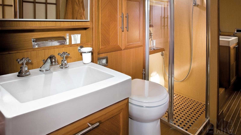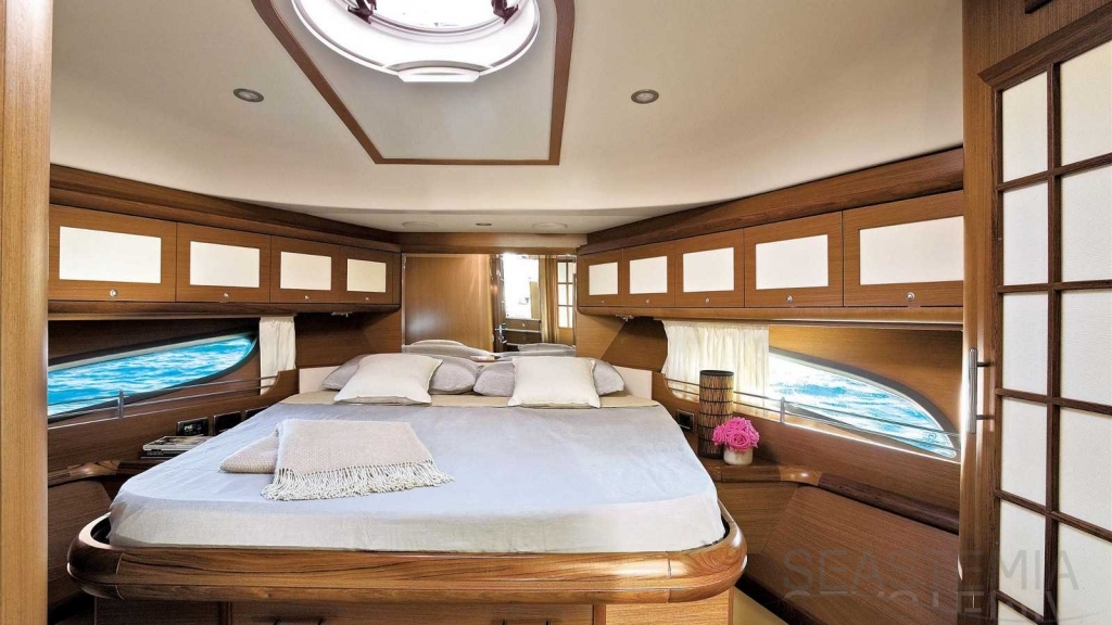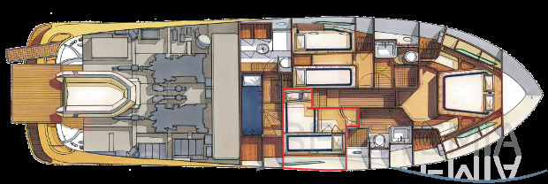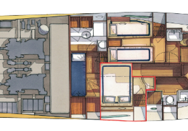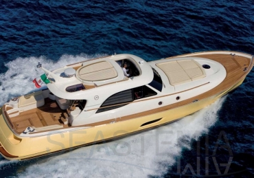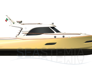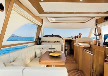 The Dolphin 54’ is offered in a warm yellow colour in sun top or flybridge version for those looking for more direct, harmonious contact with nature. Intelligent reorganisation of its layout means the Dolphin 54’ (16 metres) offers all the light and comfort of a much larger yacht. Its exterior is characterised by the supple lines typical of the Dolphin, the interior by use of solid teak throughout, including all the furnishings. Natural tones prevail in the lounge, with its sensibly and functionally arranged spaces filled with the aromas of wood and leather. On the port side is a large, extendable teak table, and a C-shaped leather couch. The starboard side, on the other hand, houses the galley, with the kitchenette leading directly to the cockpit. The sleeping area on the lower deck houses a large master cabin in the bow, illuminated by the natural light which streams in through the large windows, as well as two guest cabins – one twin, one with L-shaped beds. The pleasant and practical nature of wood accompanies the owner throughout the boat, starting from the welcoming teak cockpit floor with two comfortable couches at the sides, right up to the bow and its spacious sun pads.