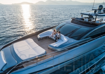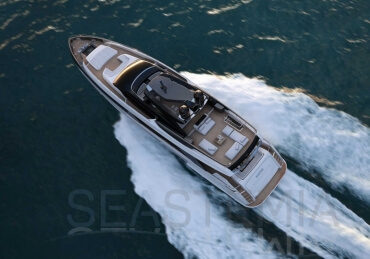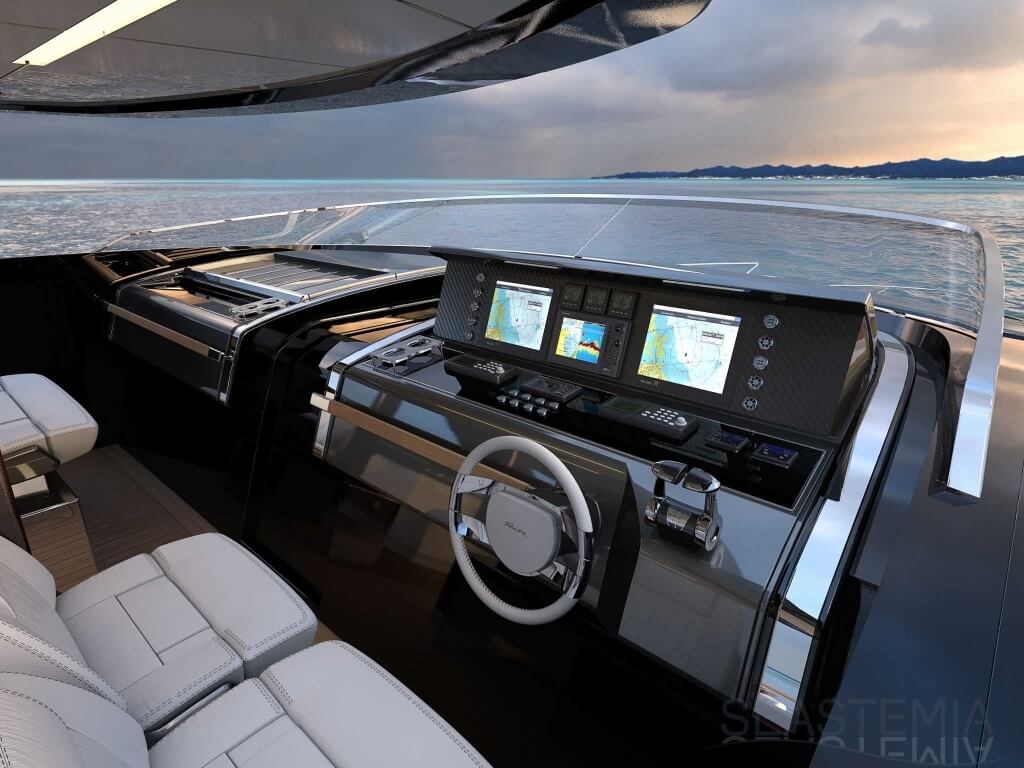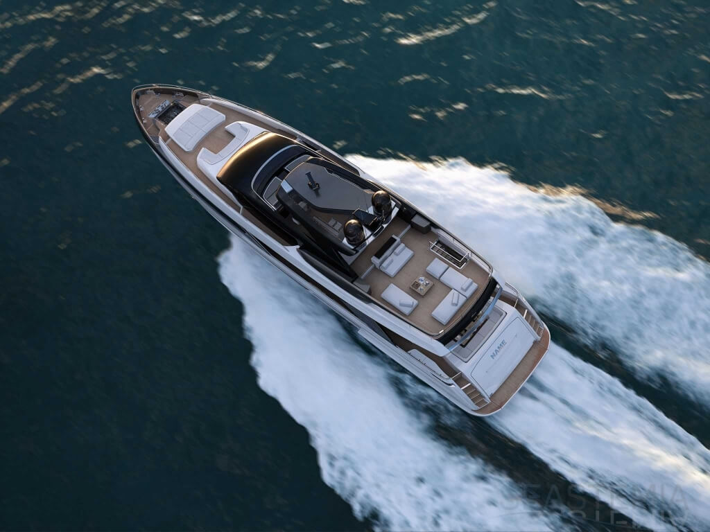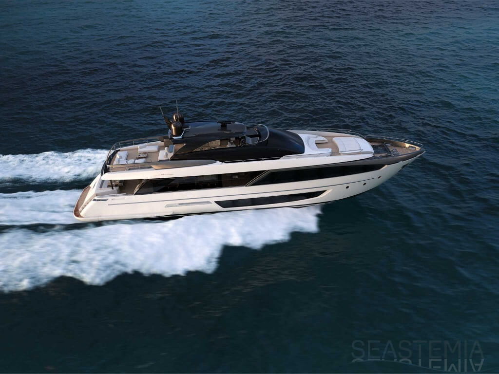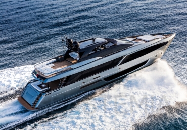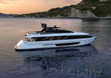 The Riva 110 'project, Riva’s new fiberglass flagship, is a promise of style, design and performance to reach levels never seen before. Through the collaboration between Officina Italiana Design, the studio founded by Mauro Micheli together with Sergio Beretta, the Ferretti Group Product Strategy Committee, and the Engineering Department, Riva 110' promises to be a magnificent and beautiful flybridge yacht, as well as larger than ever before. The completely renewed hull design measures almost 110 feet in overall length, with a beam larger than 11 feet. The exterior design further builds on the flowing lines of the 100' Corsaro. Characterized by a super sporty profile, the Riva 110' exhibits a large window in the hull with integrated porthole and, on deck, a long glass ceiling that stretches along the entire living room and it is formed by glass framed in stainless steel. The aft is equipped with the innovative Submersible Hatch, the exclusive movement system that Ferretti Group has patented, which has already convinced experts and triumphed