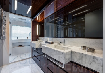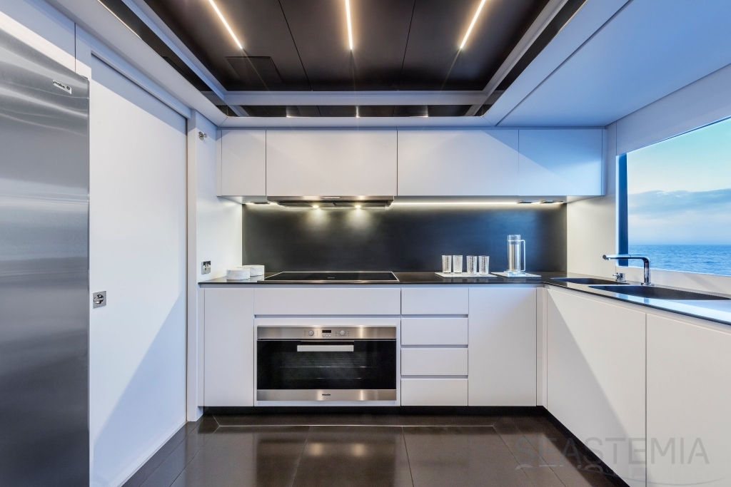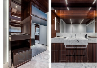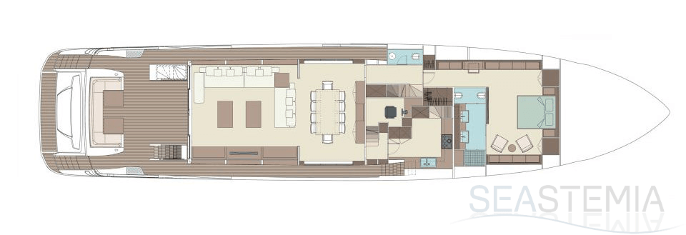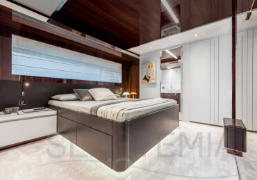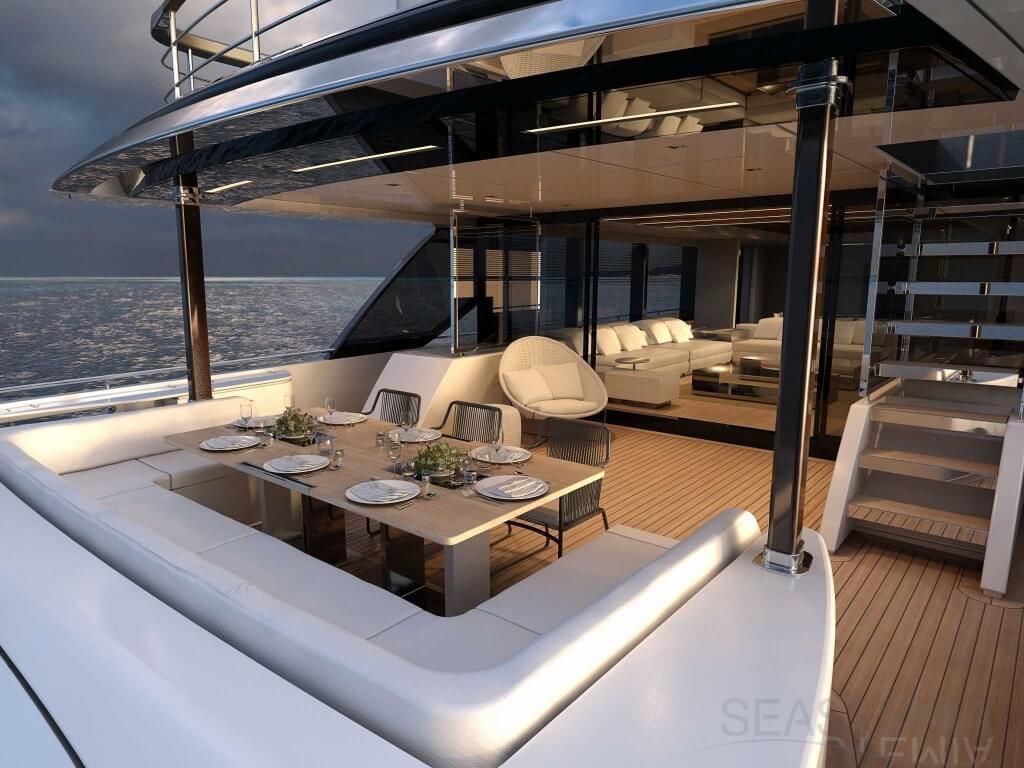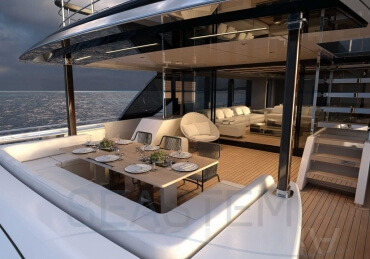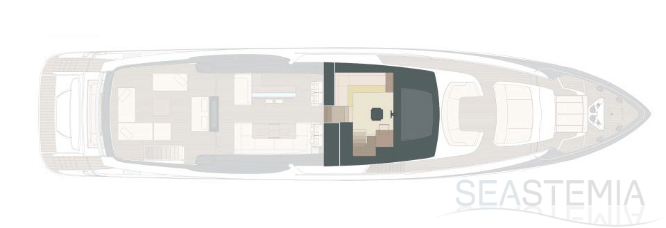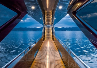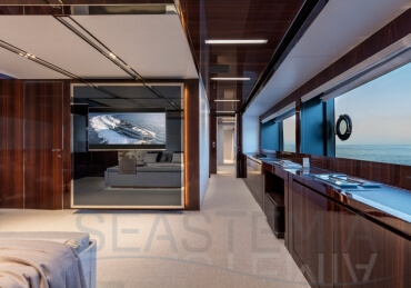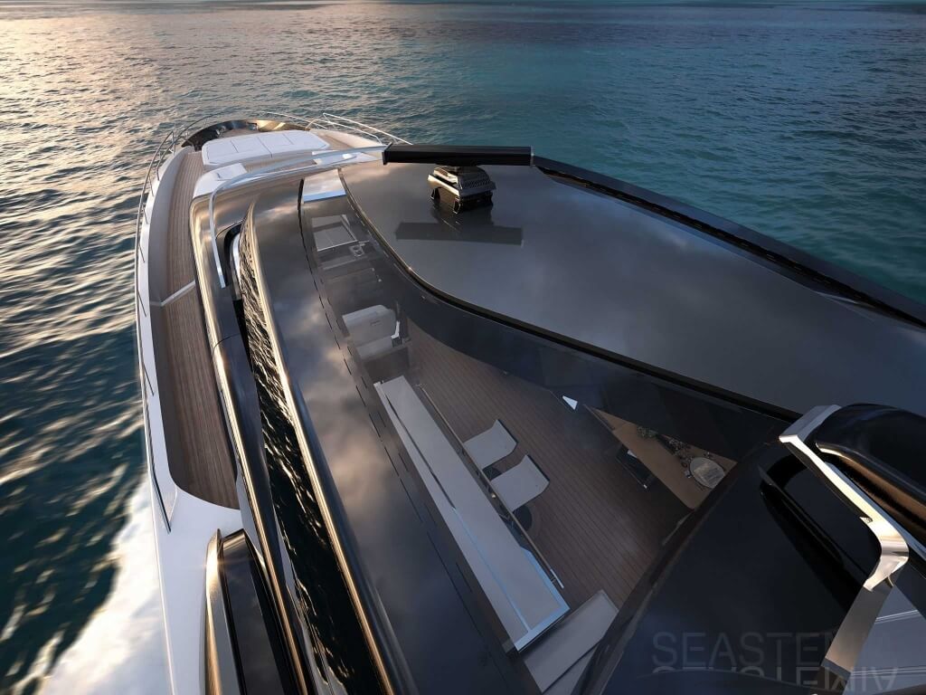 The Riva 110 'project, Riva’s new fiberglass flagship, is a promise of style, design and performance to reach levels never seen before. Through the collaboration between Officina Italiana Design, the studio founded by Mauro Micheli together with Sergio Beretta, the Ferretti Group Product Strategy Committee, and the Engineering Department, Riva 110' promises to be a magnificent and beautiful flybridge yacht, as well as larger than ever before. The completely renewed hull design measures almost 110 feet in overall length, with a beam larger than 11 feet. The exterior design further builds on the flowing lines of the 100' Corsaro. Characterized by a super sporty profile, the Riva 110' exhibits a large window in the hull with integrated porthole and, on deck, a long glass ceiling that stretches along the entire living room and it is formed by glass framed in stainless steel. The aft is equipped with the innovative Submersible Hatch, the exclusive movement system that Ferretti Group has patented, which has already convinced experts and triumphed