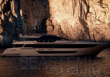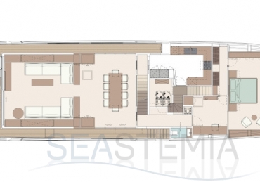 The flagship’s exteriors introduce a new concept for the stern area, which is lower, open to the water, and divided into a large Beach Club and a generous cockpit: over 60 square metres of liveable space. The jet ski, tender and seabob are stored in the port hull side. In the bow, the owner is accommodated in a spacious area divided into a lounge, a large sun pad and other more intimate, private spaces. On the upper deck - where the outdoor area in the stern is set up as a dining area seating ten - the side walkways create two closed, private balconies. Above this is the sundeck, an area where guests can be invited for cocktails in a relaxing atmosphere.
