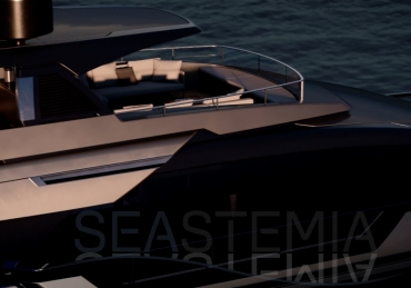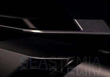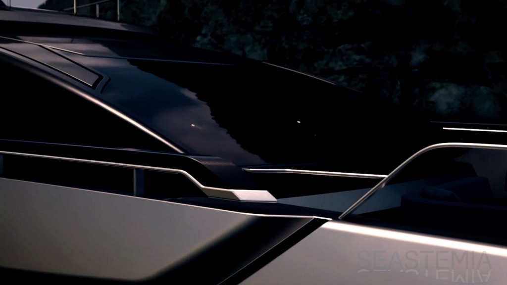 Aft, the all-glass fashion plates enhance the aerodynamics of the yacht and tell a story of appeal and elegance. The air intake grills and carbon fibre detailing are a reference to traditional car design, while the hard top brings dynamism and style with its sporty personality.