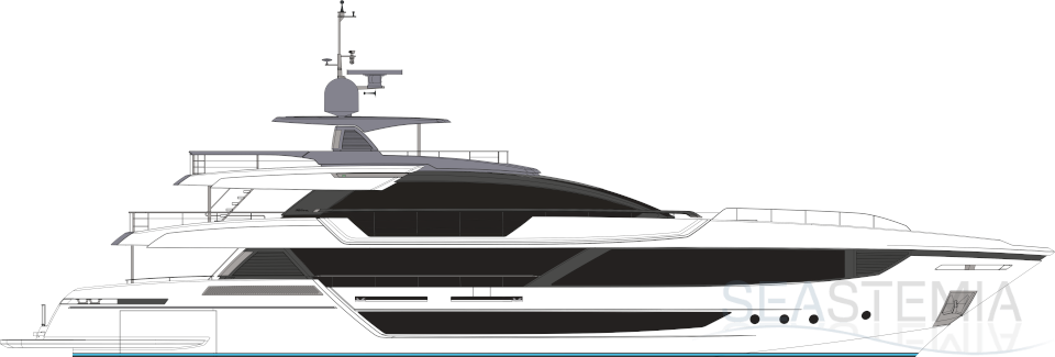 Riva 130’ Bellissima is the first planing flybridge in the range to extend across three real decks, with a full-wide-body design, while remaining under 300 GT. The brainchild of Mauro Micheli, founder with Sergio Beretta of Officina Italiana Design, the firm that has designed all Riva’s yachts for the last 27 years, working in partnership with the Strategic Product Committee led by Mr. Piero Ferrari and the Ferretti Group Engineering Department.