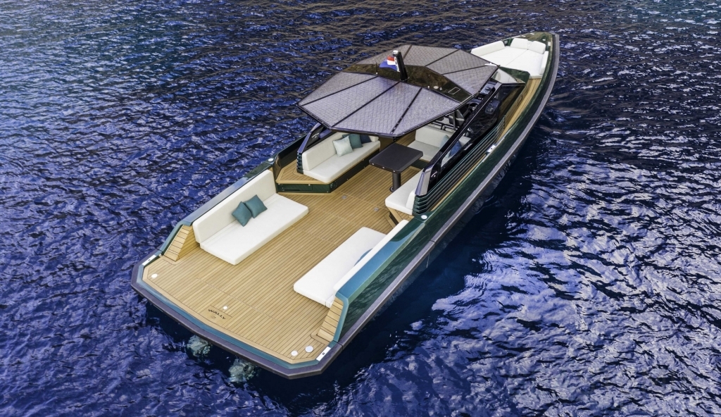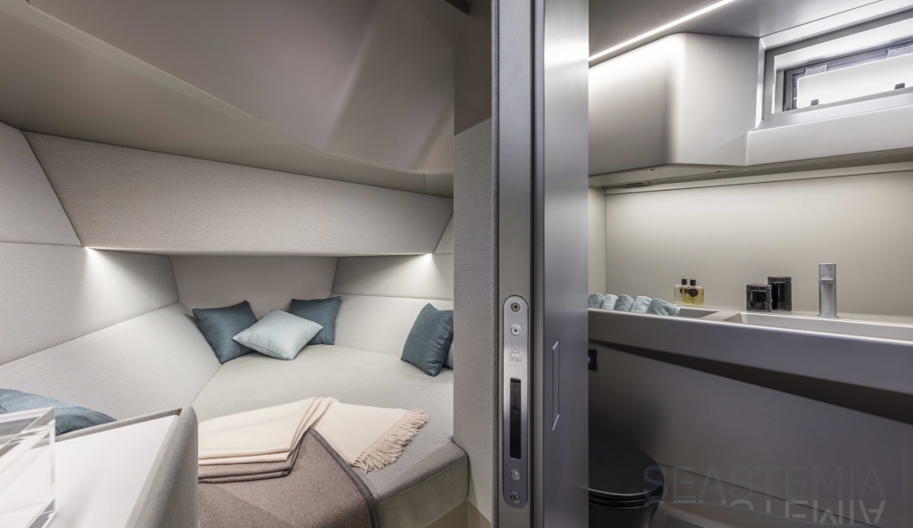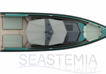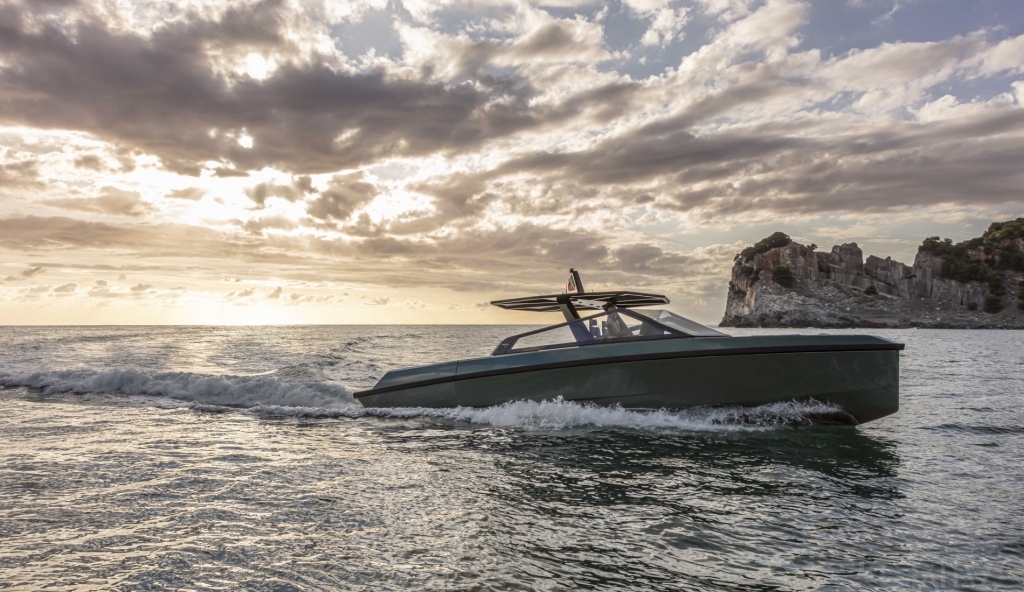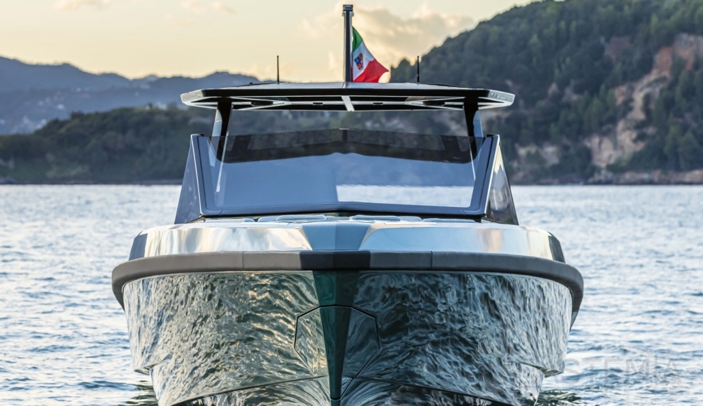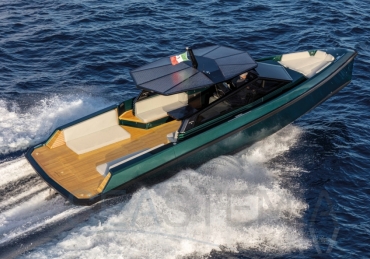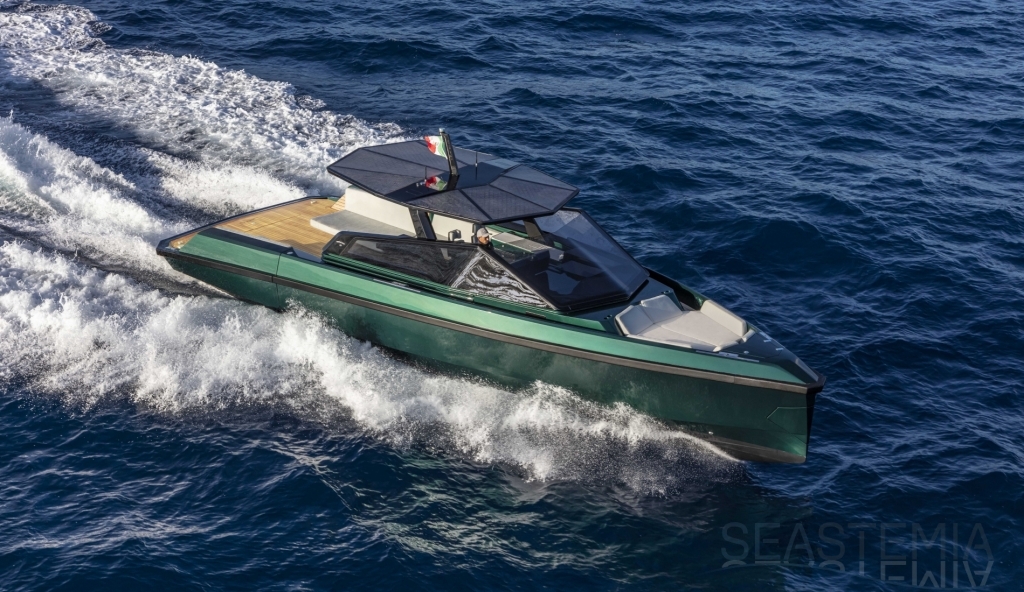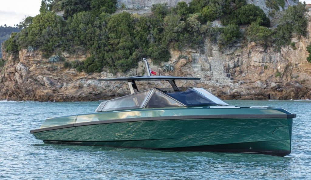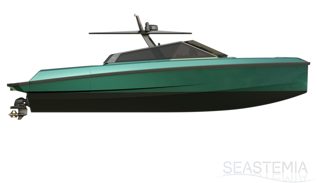 Abundance of standard design features: side-opening bulwarks, T-top carbon fiber superstructure with laminated sail cloth, carbon fiber swimming ladder, wraparound glass windshield, concealed hydraulic push-button anchor system, teak decking, wraparound fender, flanking walkways, large foredeck sunpad, fold-out dining table, plenty of seating, fridge, insulated ice box locker, LED deck lighting, generous bathroom facilities with separate shower compartment, cabin with bed, unique head-turning colors.