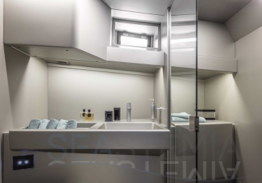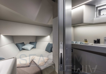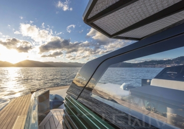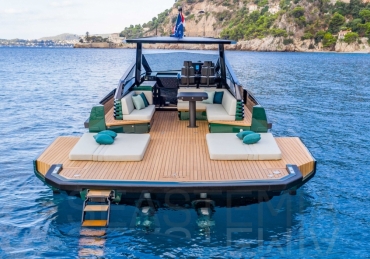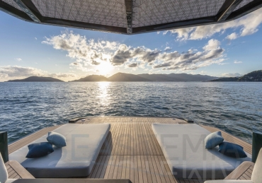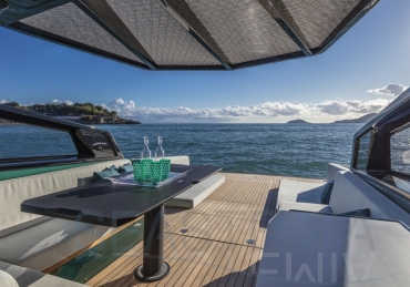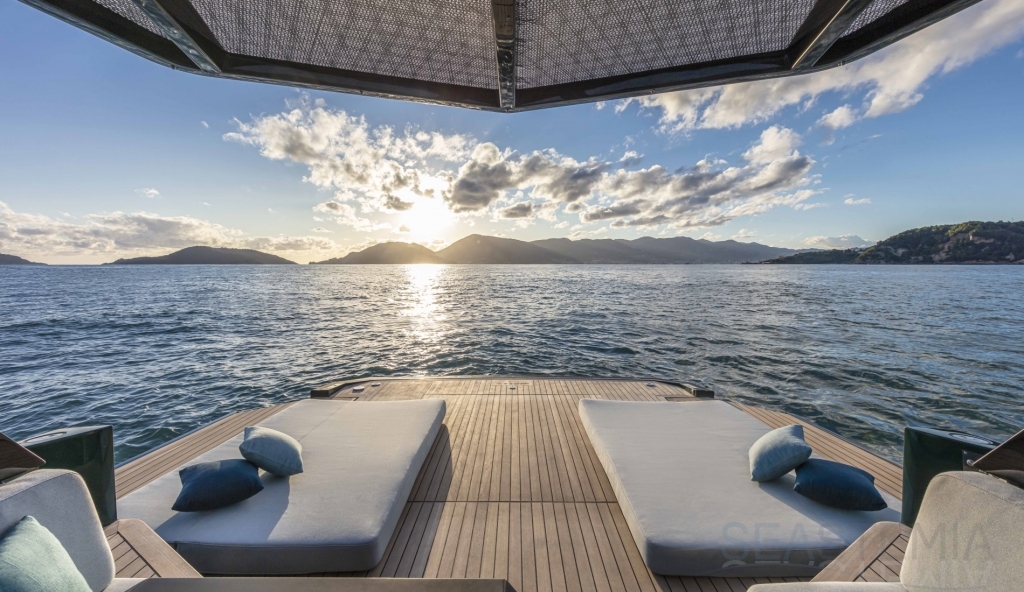 Options include raised aft sunbed with garage for watersport accessories, second larger fridge, ice maker, diesel generator, air conditioning both inside and outside in the cockpit area, SeaKeeper stabilizer system, automated retractable swimming ladder/passerelle.