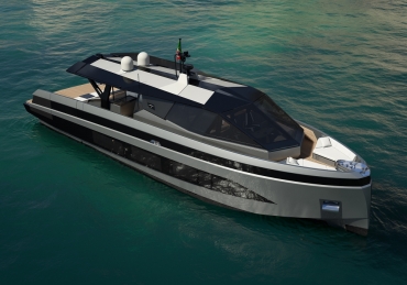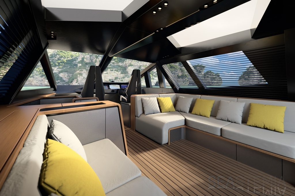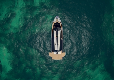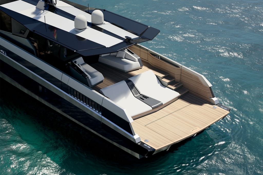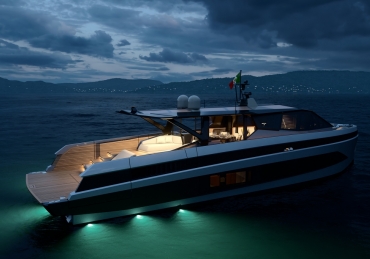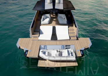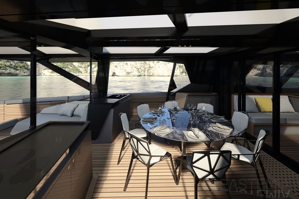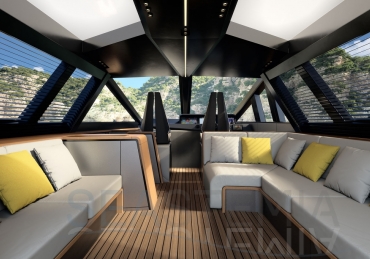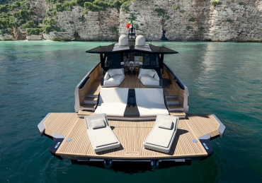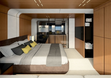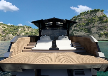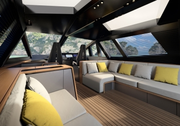 At its core is a single flush deck running from bow to stern. Chameleon-like, it adapts stylishly to different occasions thanks to a hybrid inside-outside concept. There’s dining for six, two chaises-longs, a bar and a galley, where the interplay between opening sides and aft doors can completely alter the ambiance. The wheelhouse can be easily closed off and the cockpit turned into a cosy movie lounge.