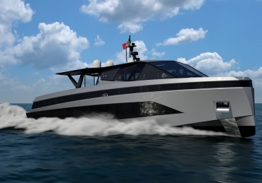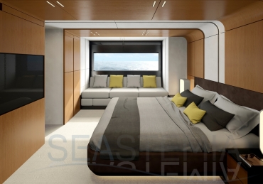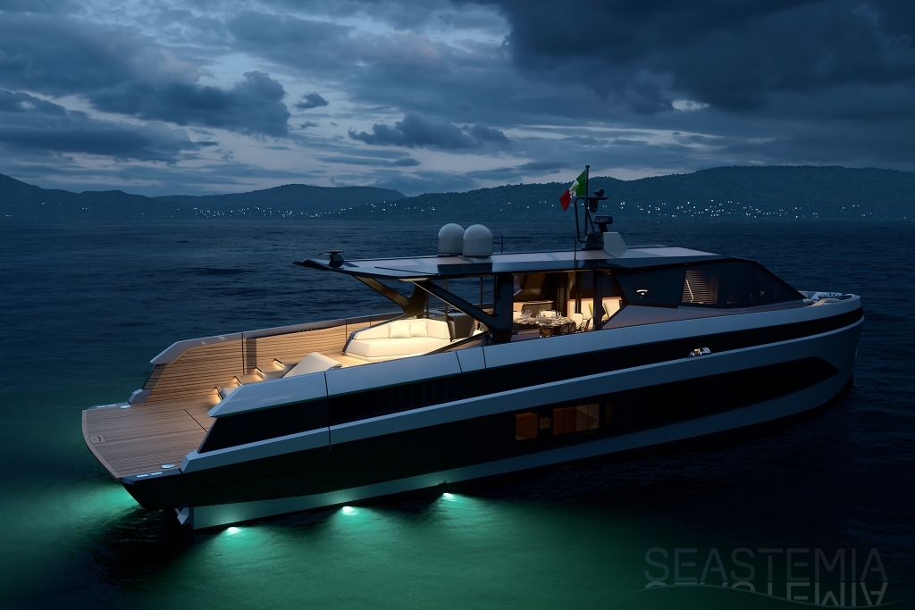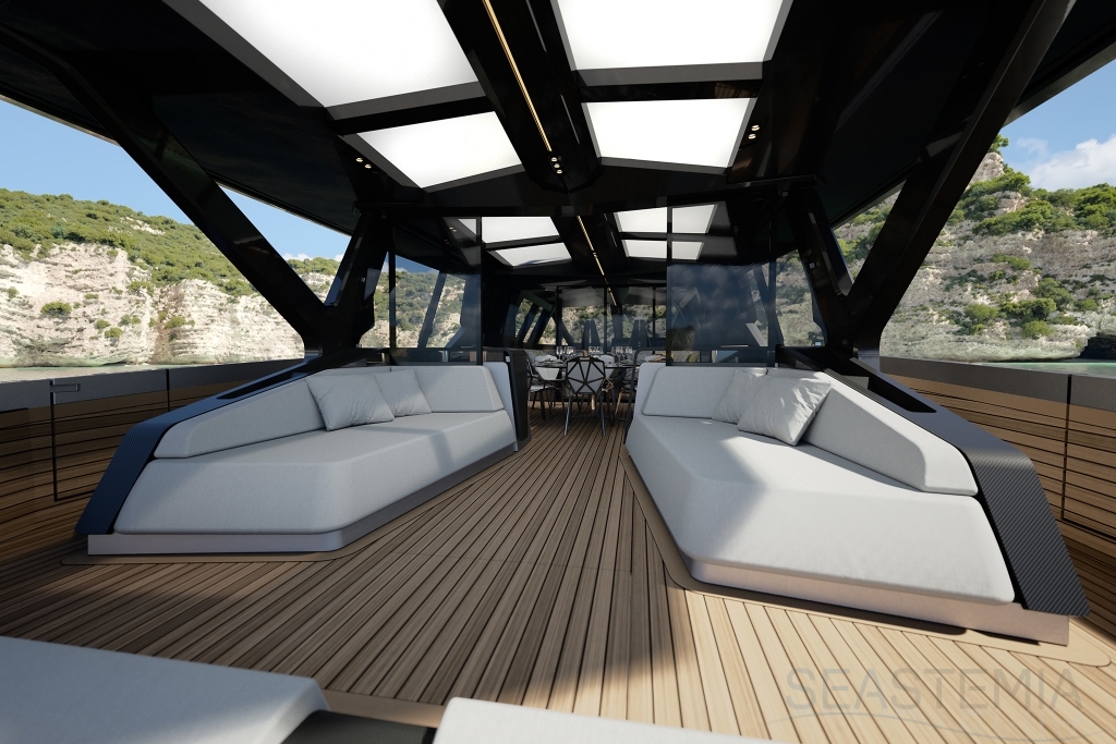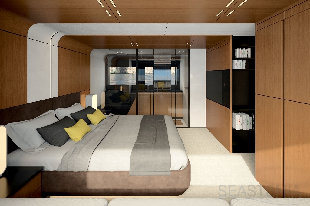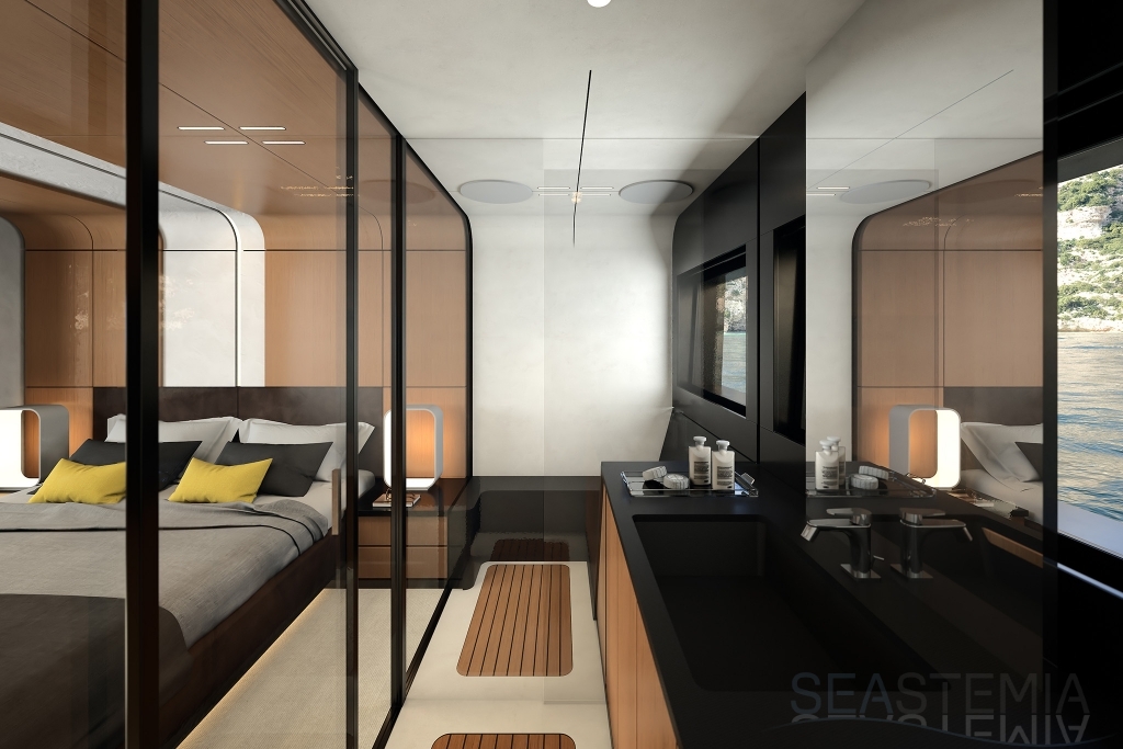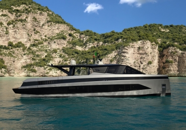 At its core is a single flush deck running from bow to stern. Chameleon-like, it adapts stylishly to different occasions thanks to a hybrid inside-outside concept. There’s dining for six, two chaises-longs, a bar and a galley, where the interplay between opening sides and aft doors can completely alter the ambiance. The wheelhouse can be easily closed off and the cockpit turned into a cosy movie lounge.