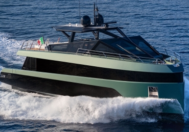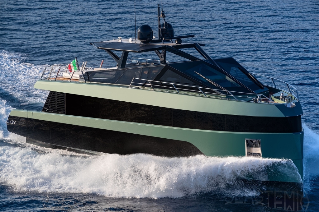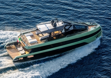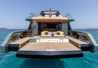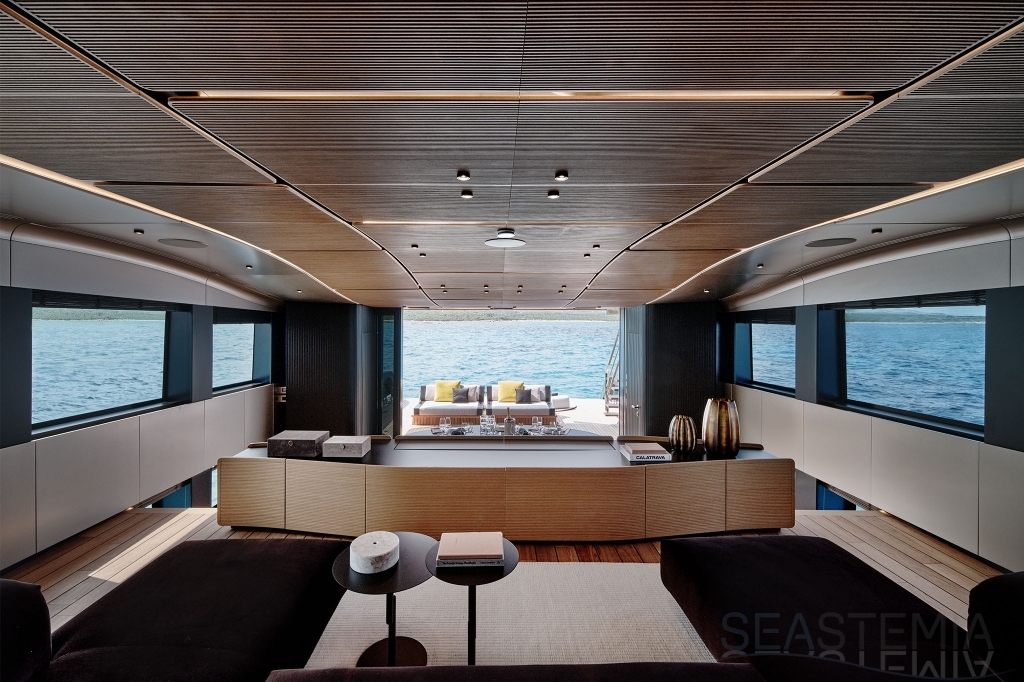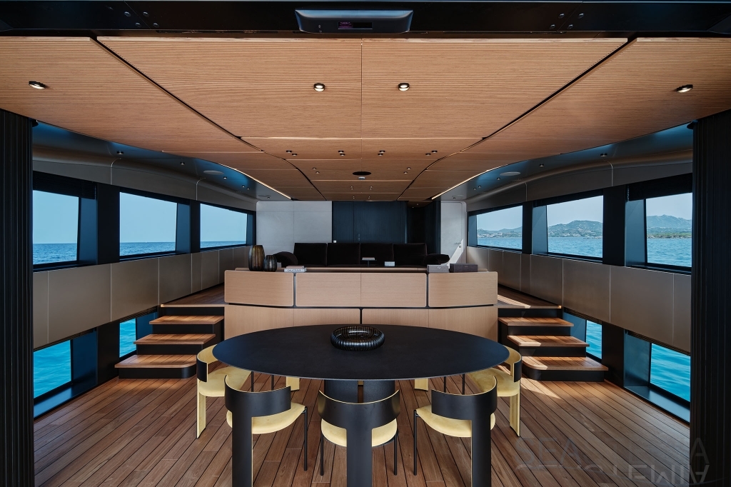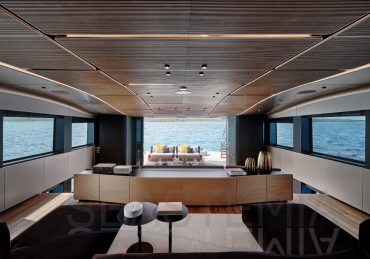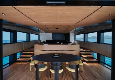 Overcoming engineering challenges, Wally’s use of floor-to-ceiling glass floods the flexible dining and lounging space of the main saloon with light. Unheard of 2.5m headroom and flush decking allow