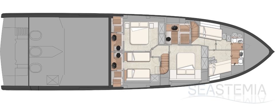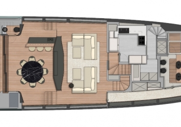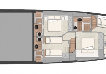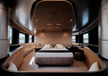 What other sub-24m yacht is able to offer such a large master cabin on the main deck? From this ‘amphitheatre of the sea’, the wrap-around glazing in the high bow gives the owner a breathtaking 270-degree view from the comfort of their large double bed.