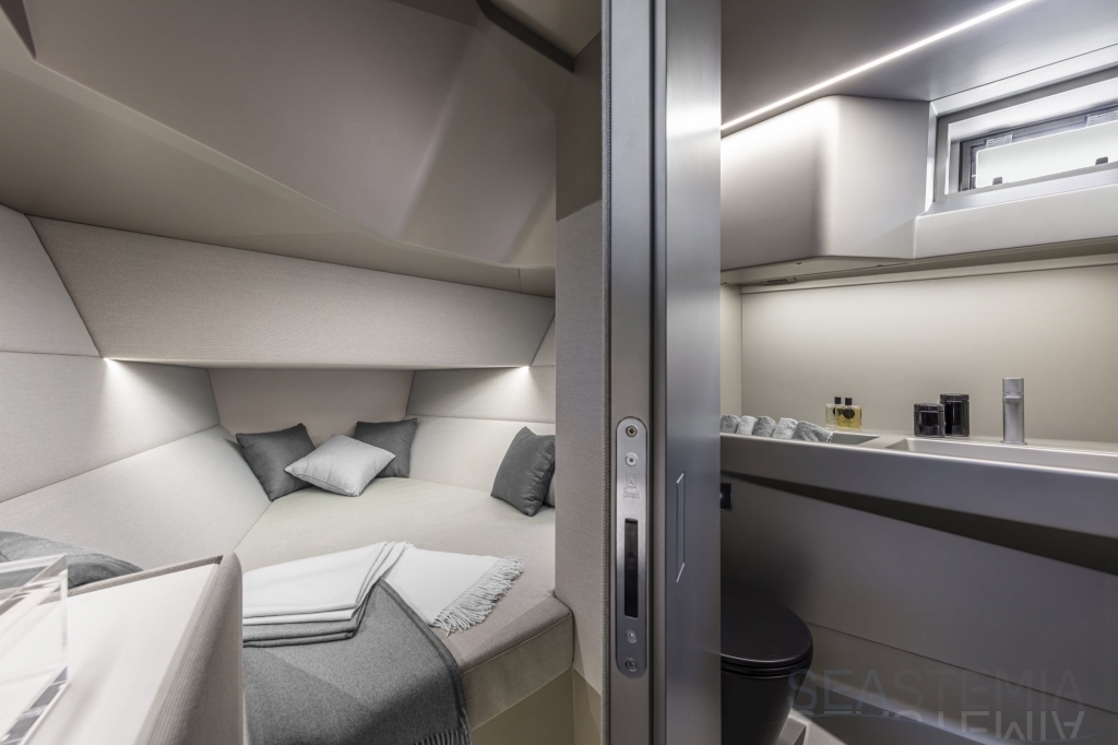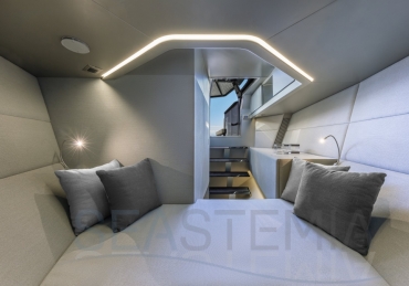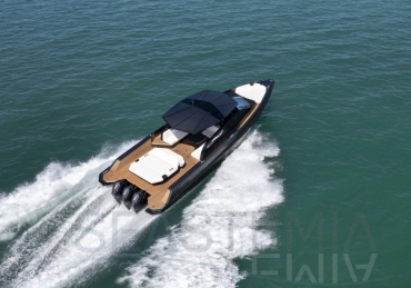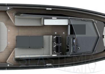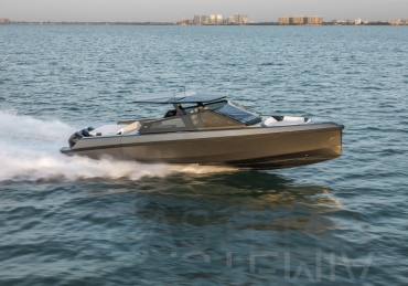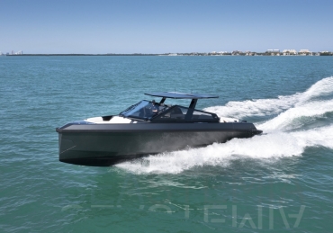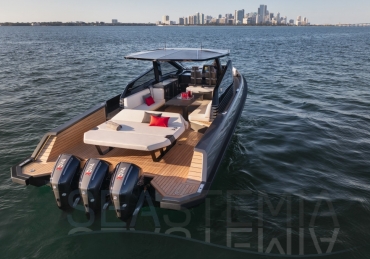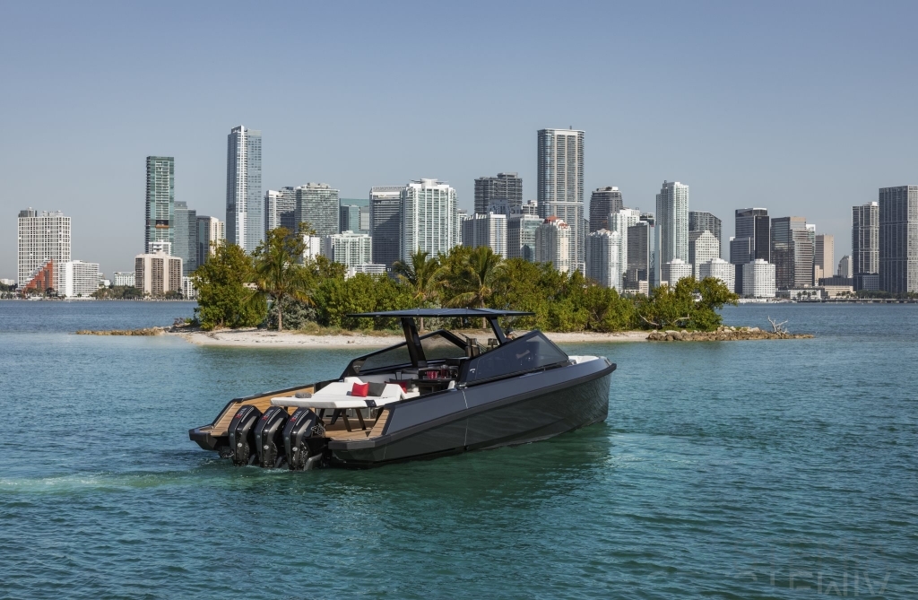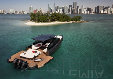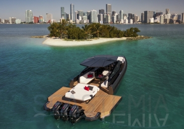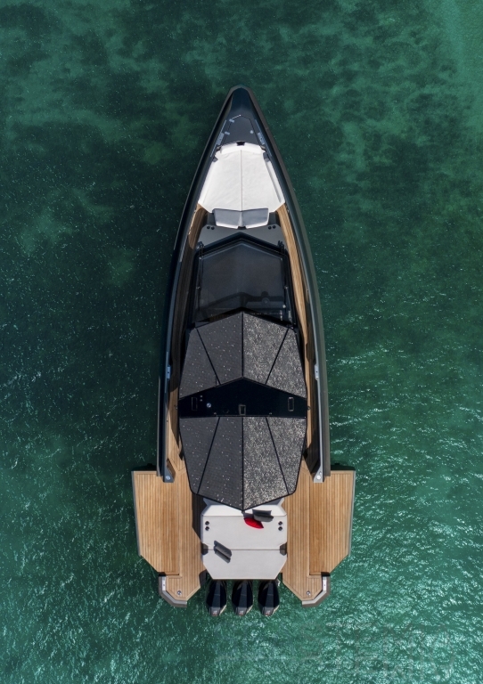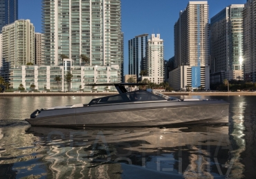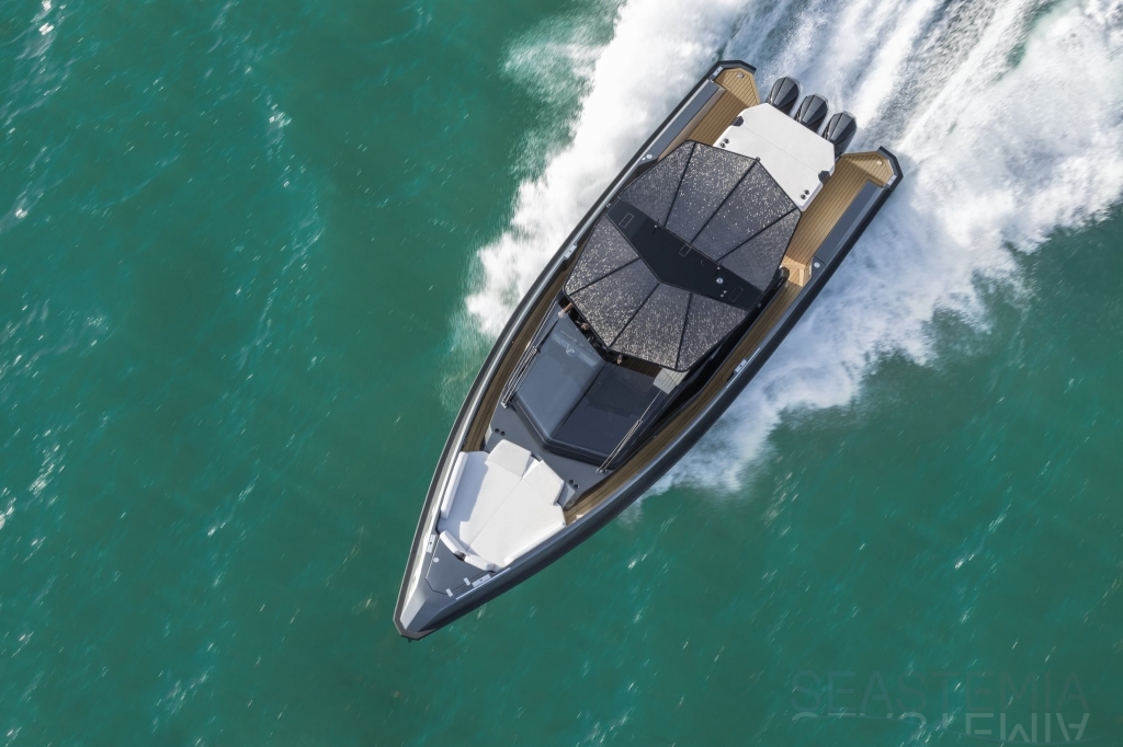 Packing the same angular aesthetic and slippery hull as the wallytender43, this outboard version can exceed 50 knots with the option of three Mercury Verado 450R racing engines. And yet, control is pitch-perfect; the hull delivering exceptional seaworthiness. Joystick controls, dynamic positioning and autopilot come as standard.